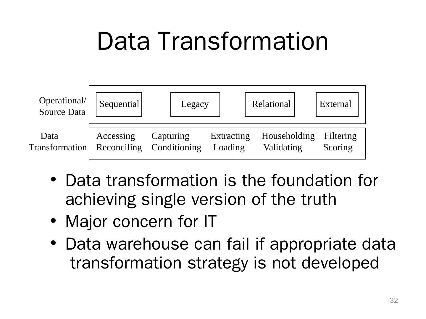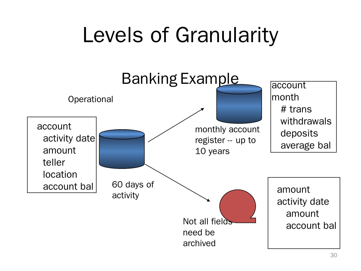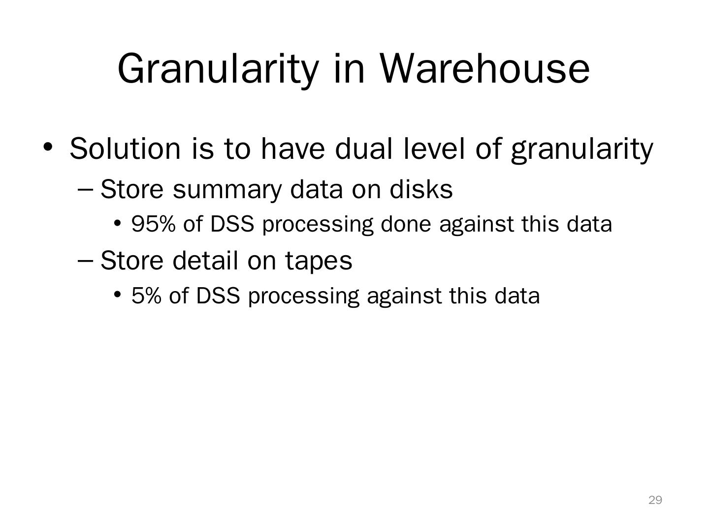 29 .29 Granularity in Warehouse Solution is to have dual level of granularity Store summary data on disks 95% of DSS processing done against this data Store detail on tapes 5% of DSS processing against this data