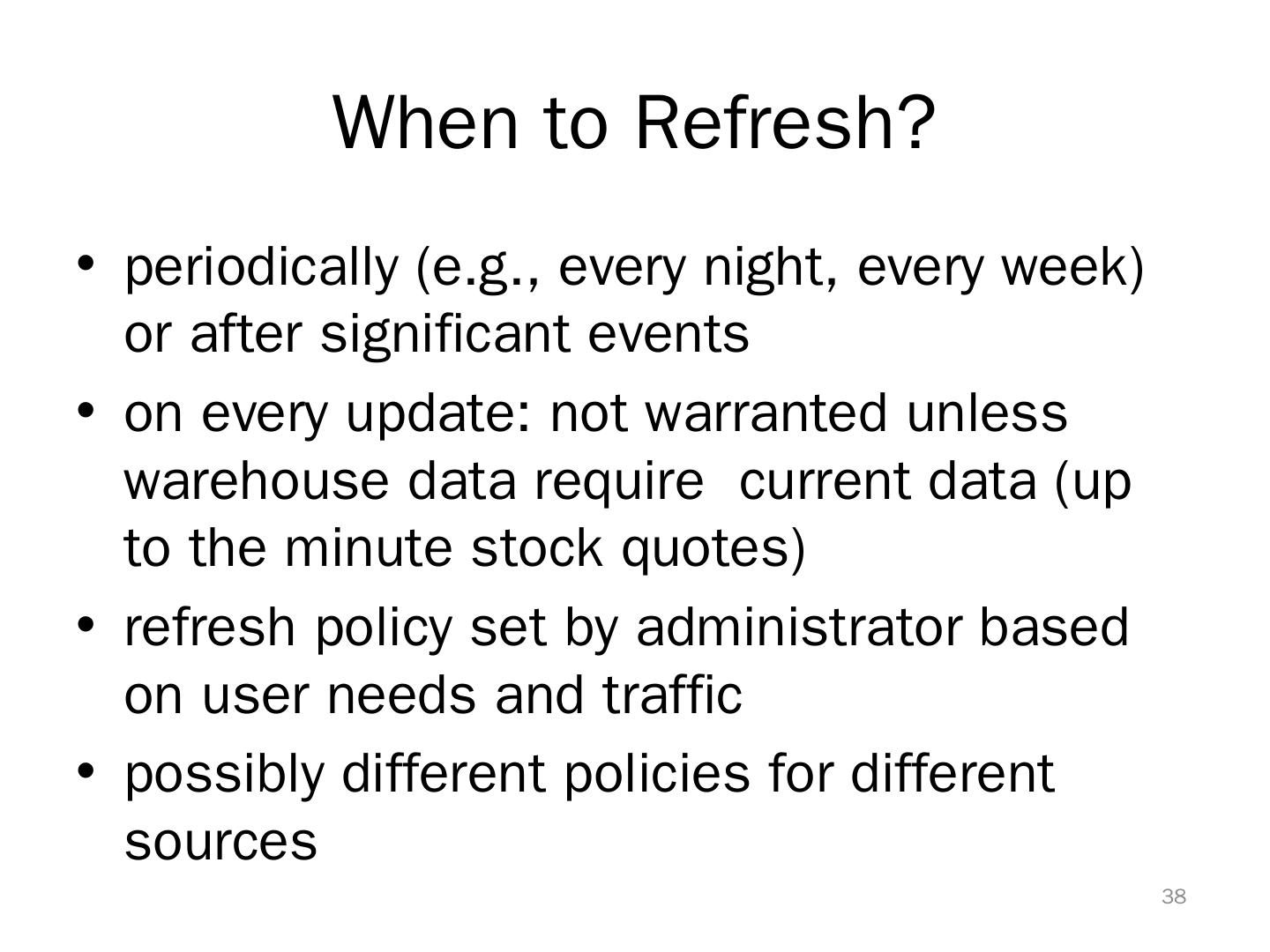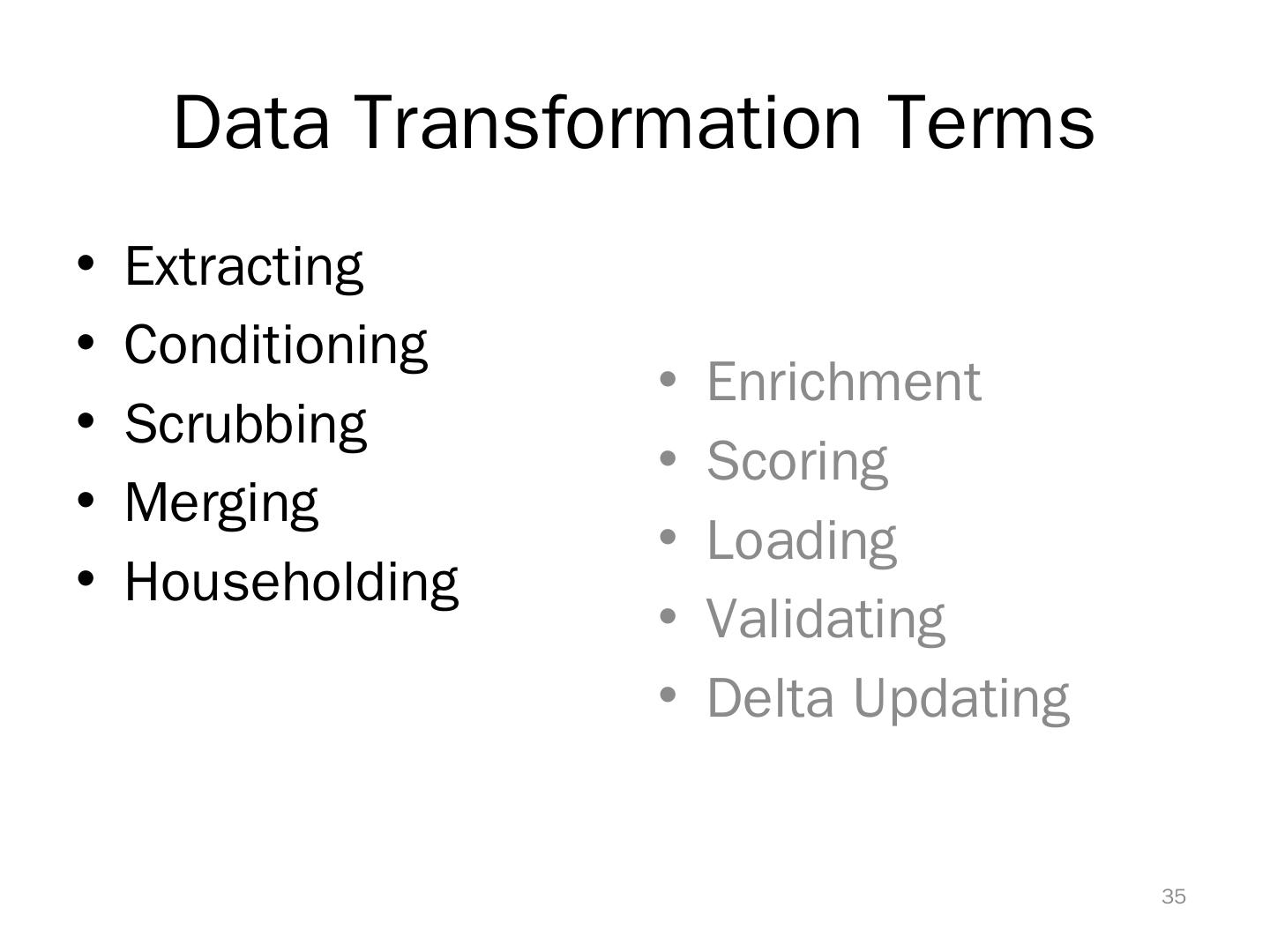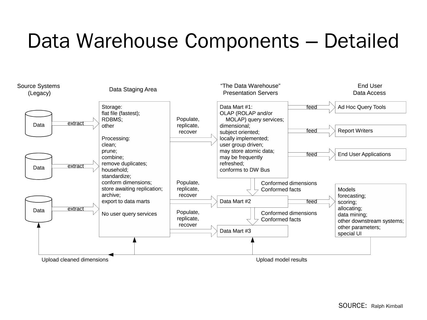 11 .Data Warehouses, Data Marts, and Operational Data Stores Data Warehouse – The queryable source of data in the enterprise. It is comprised of the union of all of its constituent data marts. Data Mart – A logical subset of the complete data warehouse. Often viewed as a restriction of the data warehouse to a single business process or to a group of related business processes targeted toward a particular business group. Operational Data Store (ODS) – A point of integration for operational systems that developed independent of each other. Since an ODS supports day to day operations, it needs to be continually updated.