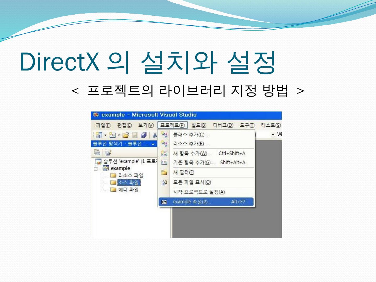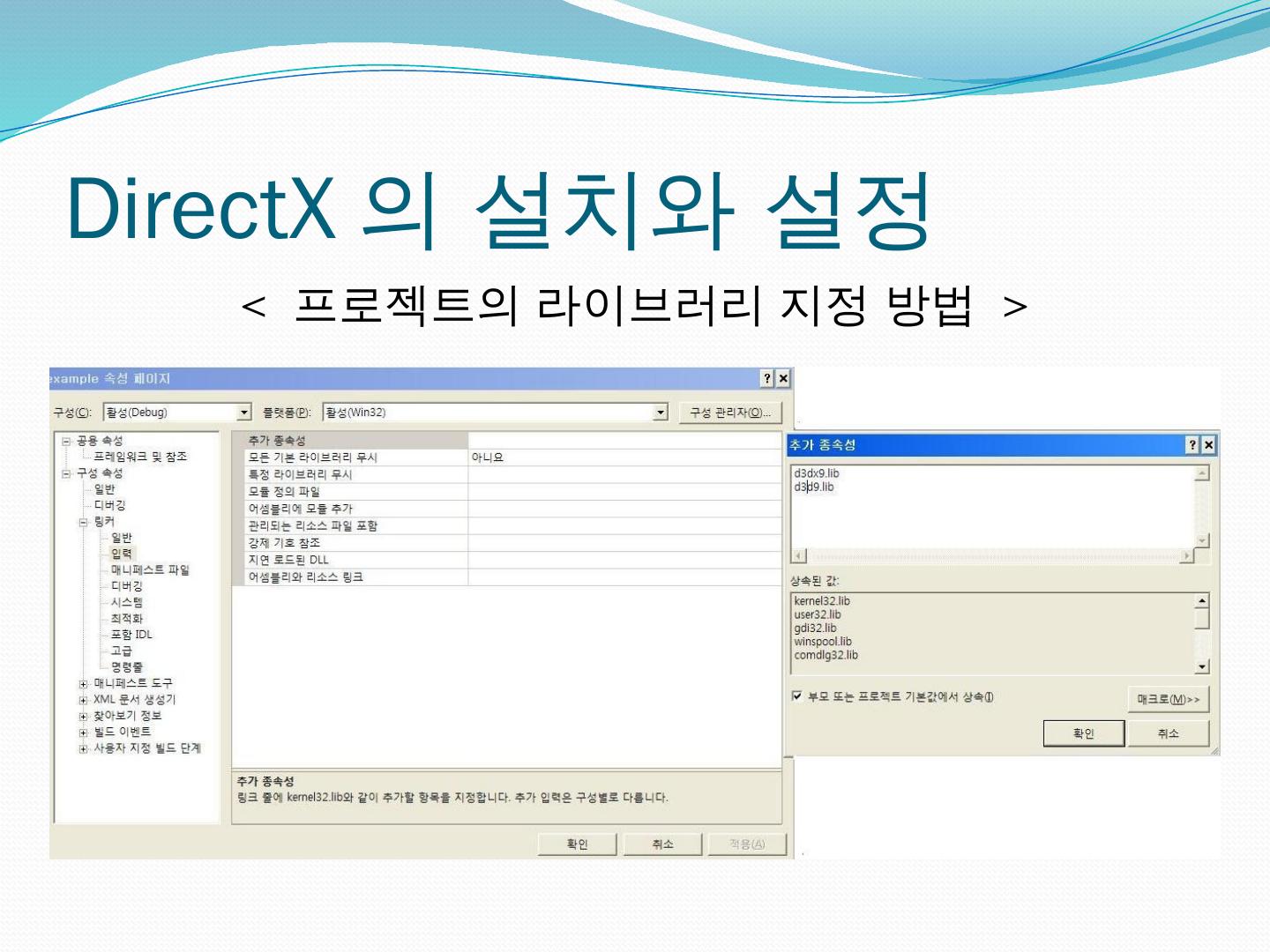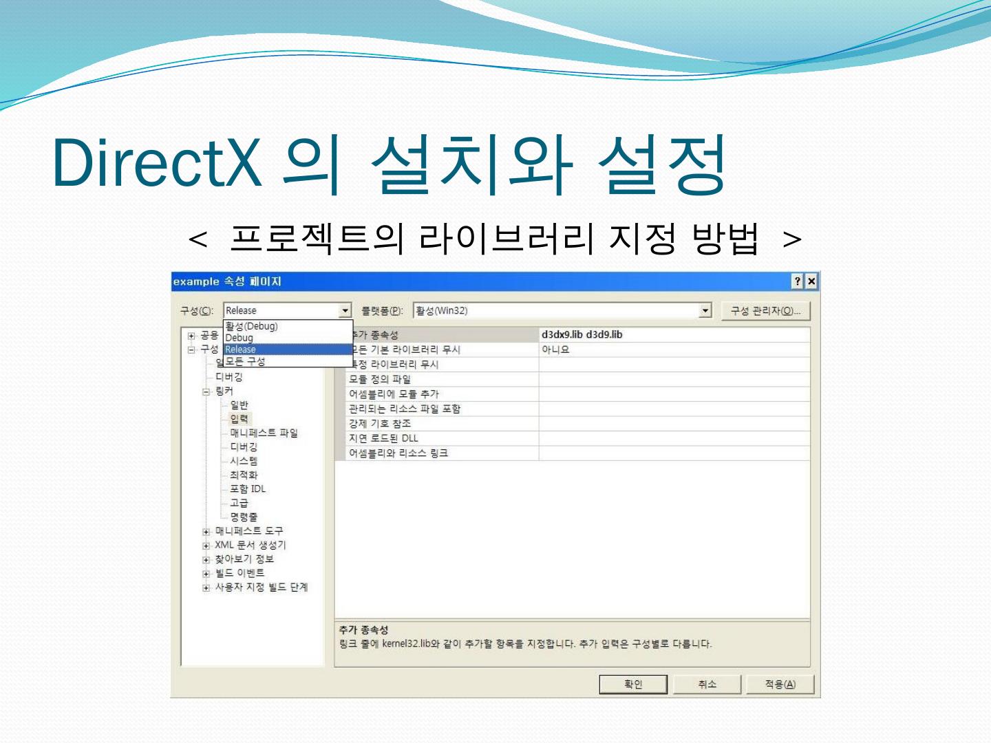 < 프로젝트의 라이브러리 지정 방법 >. Direct3D 초기화. Direct3D ? 프로그래머와 그래픽 하드웨어를 연결하는 매개자. 애플리케이션 - Direct3D - HAL - 그래픽장치.