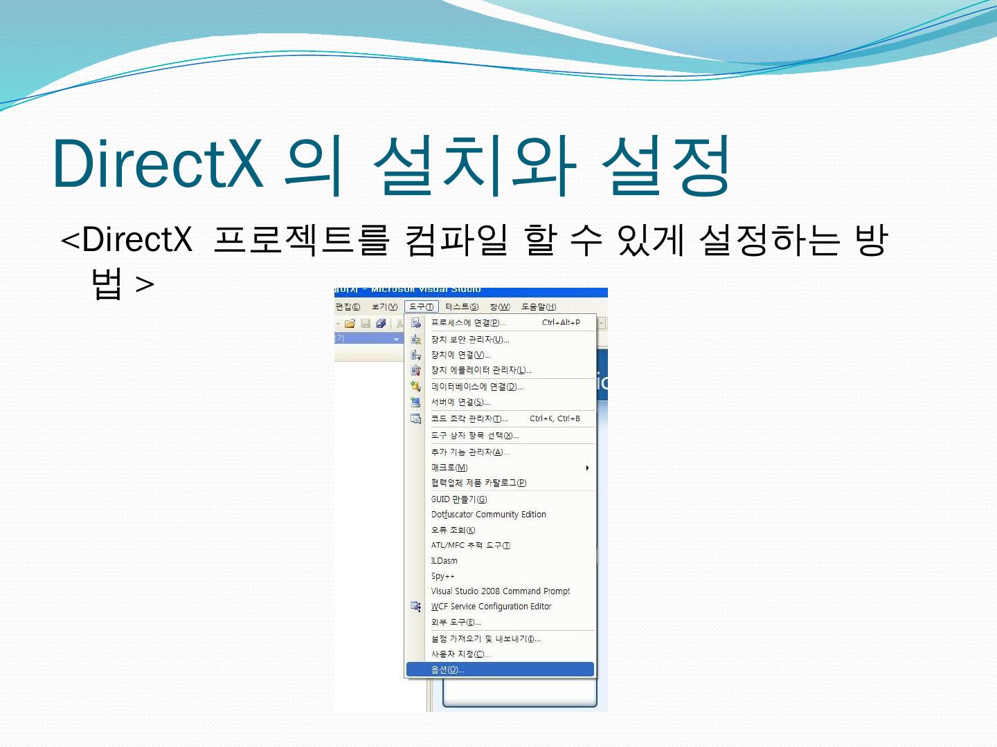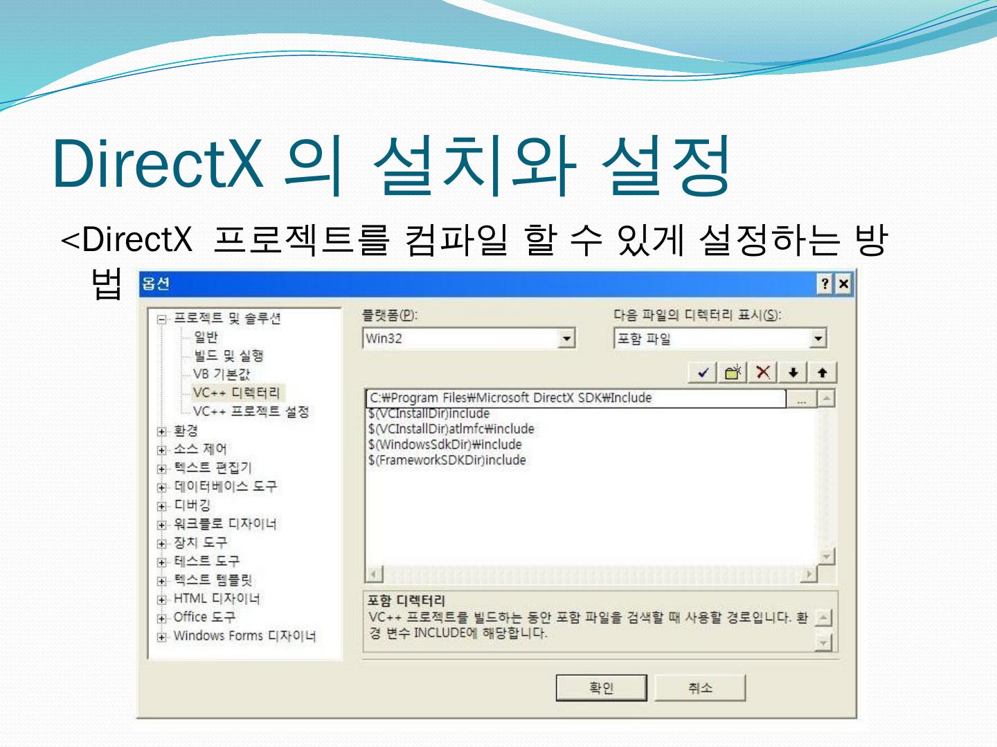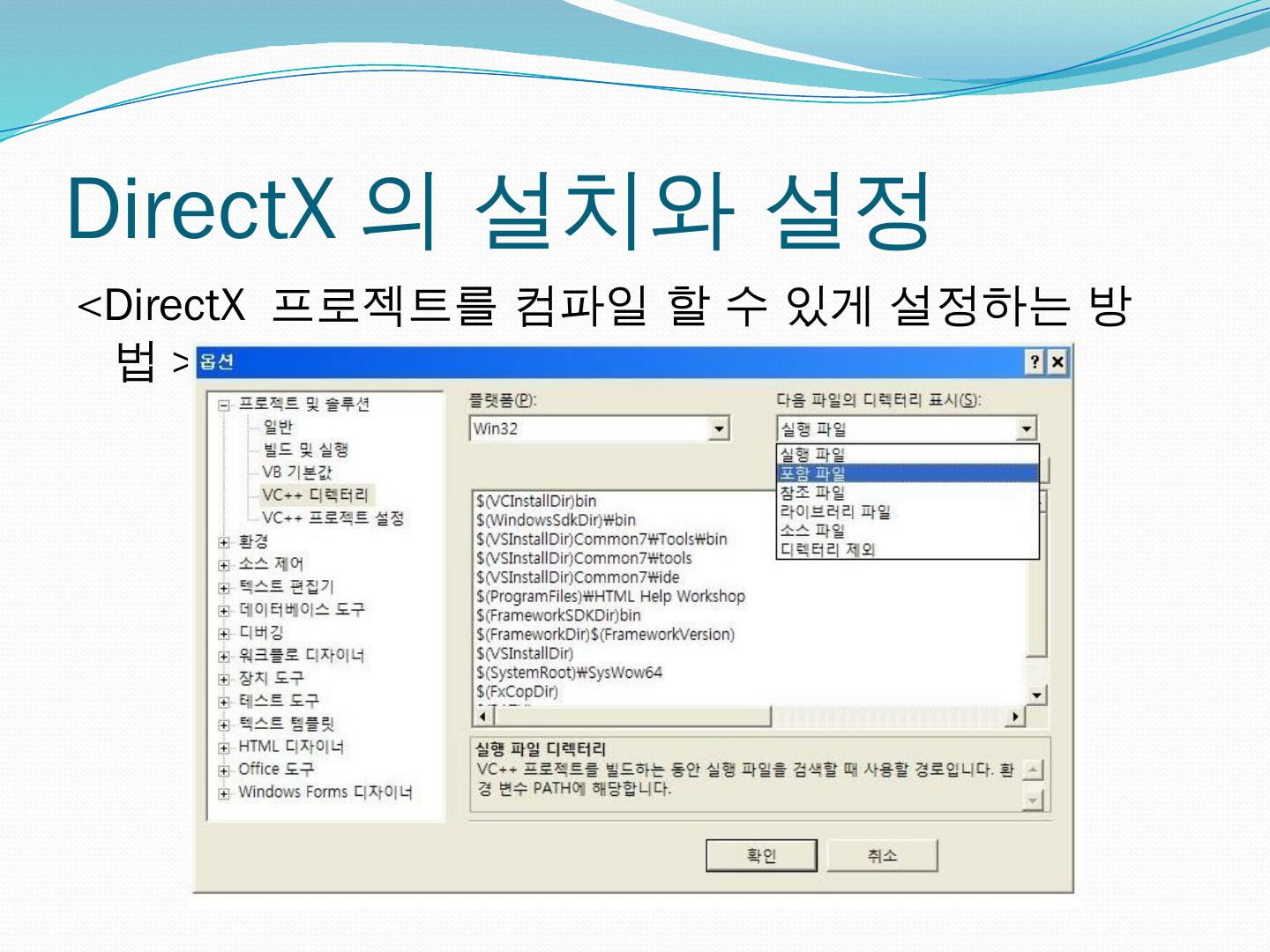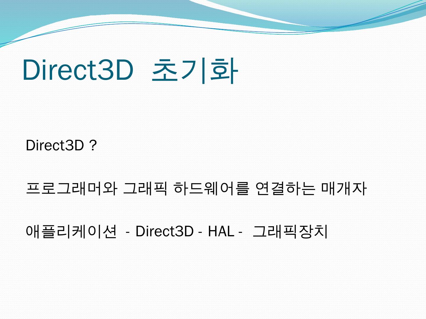 < 프로젝트의 라이브러리 지정 방법 >. Direct3D 초기화. Direct3D ? 프로그래머와 그래픽 하드웨어를 연결하는 매개자. 애플리케이션 - Direct3D - HAL - 그래픽장치.