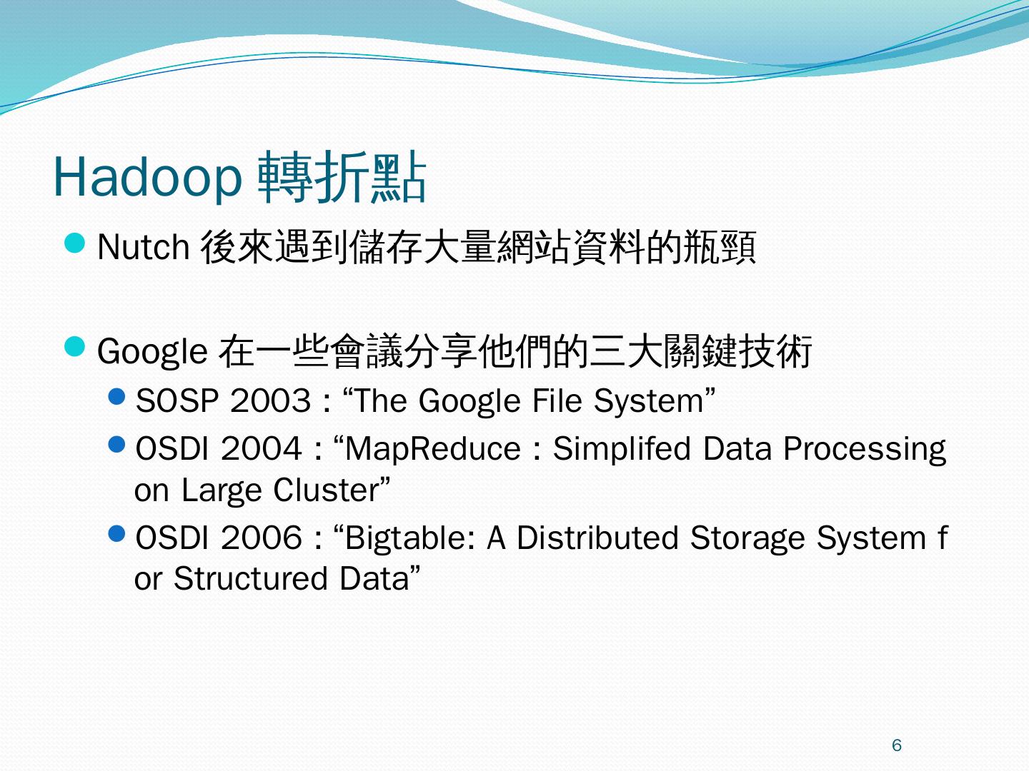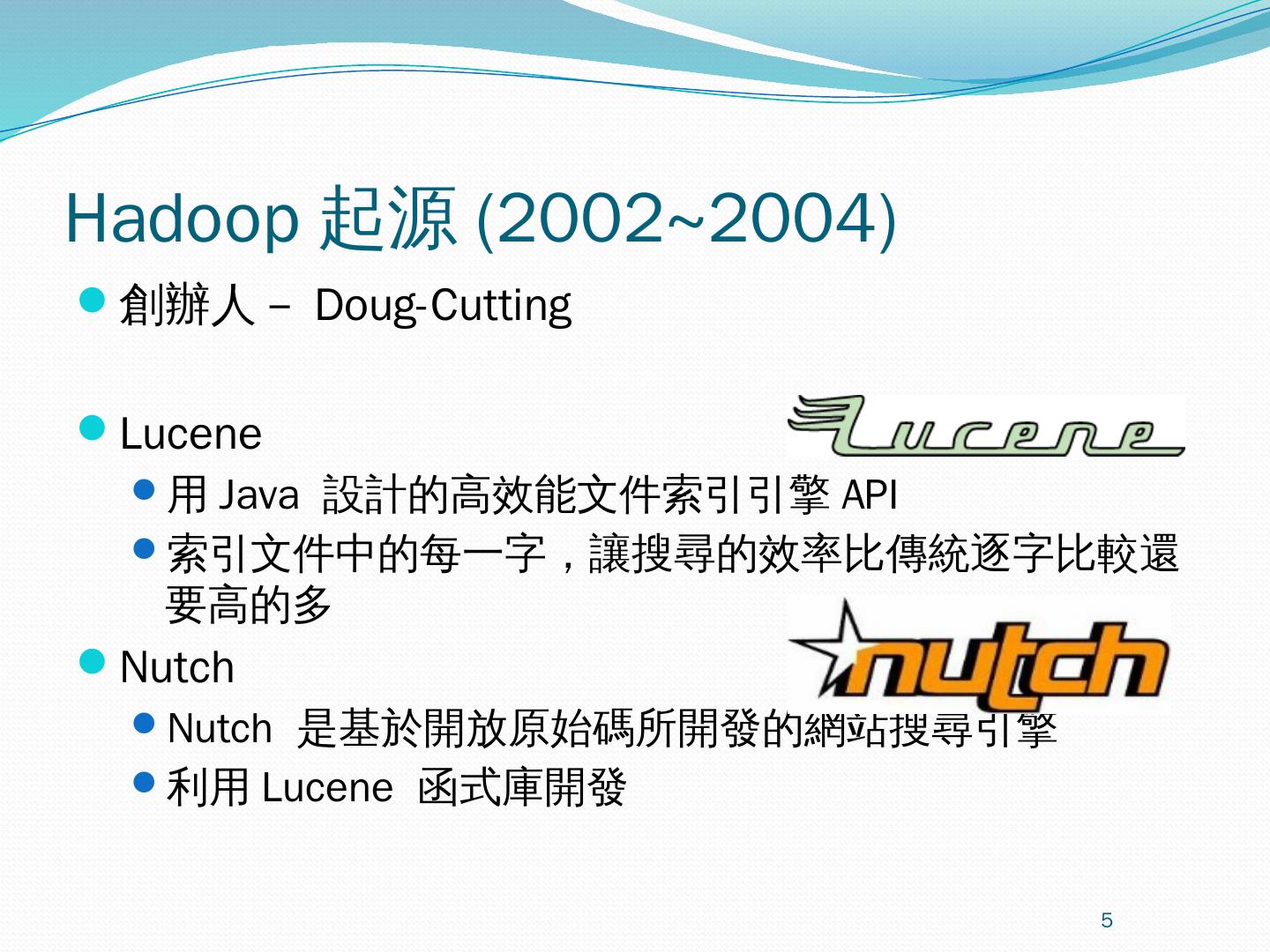 一個Apache專案; 分散式計算的平台; 提供使用者簡易撰寫並執行處理海量資料應用程式的軟體平台。 Hadoop Distributed File System (HDFS). MapReduce. Hbase.