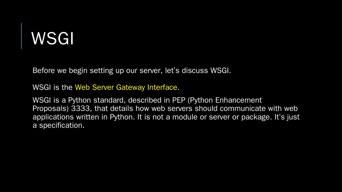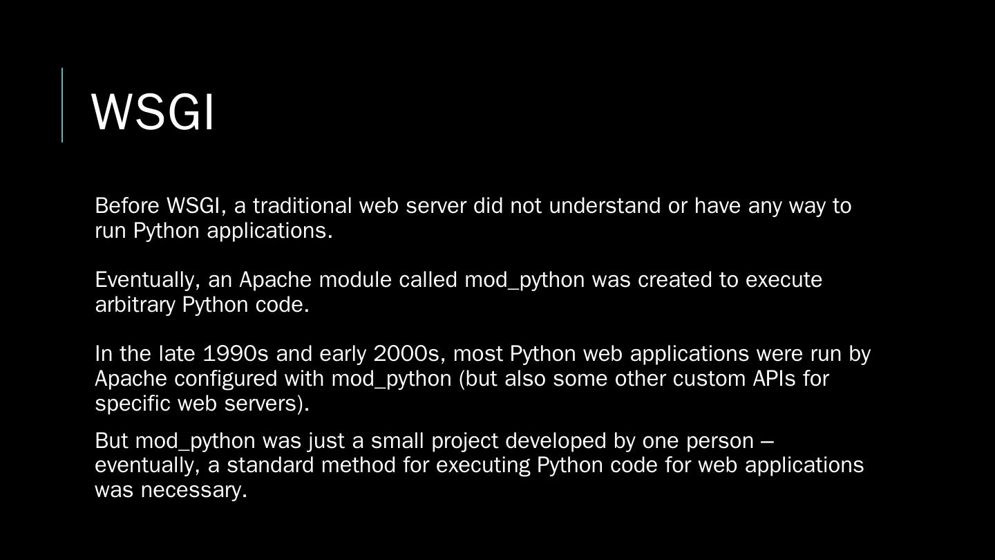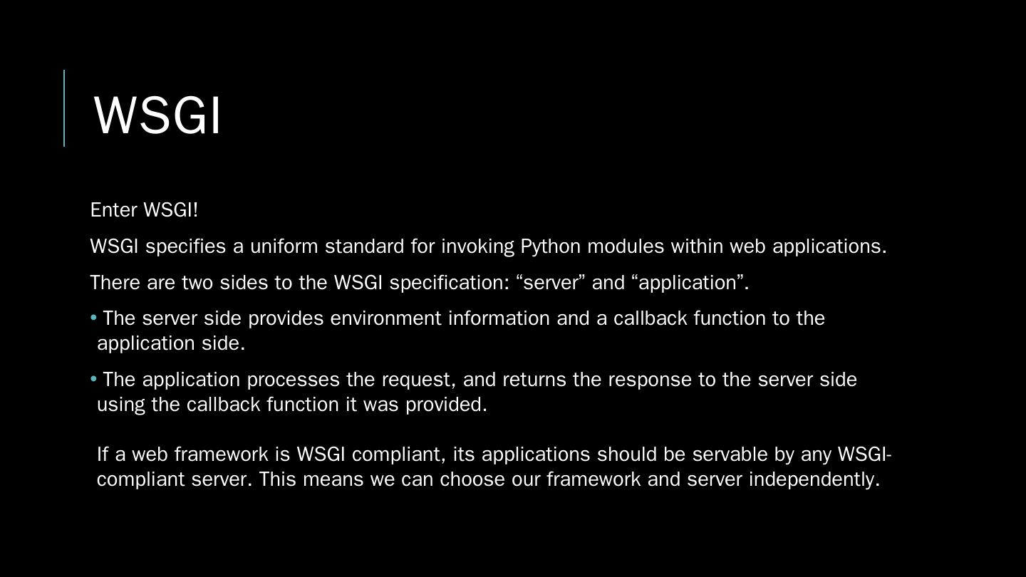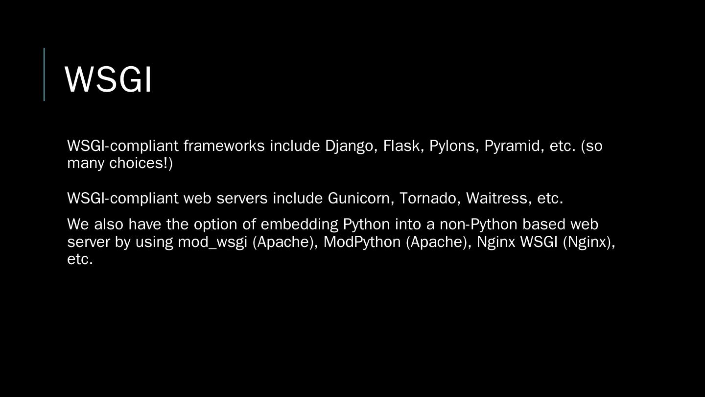 We also have the option of embedding Python into a non-Python based web server by using mod_wsgi (Apache), ModPython (Apache), Nginx WSGI (Nginx), etc ...