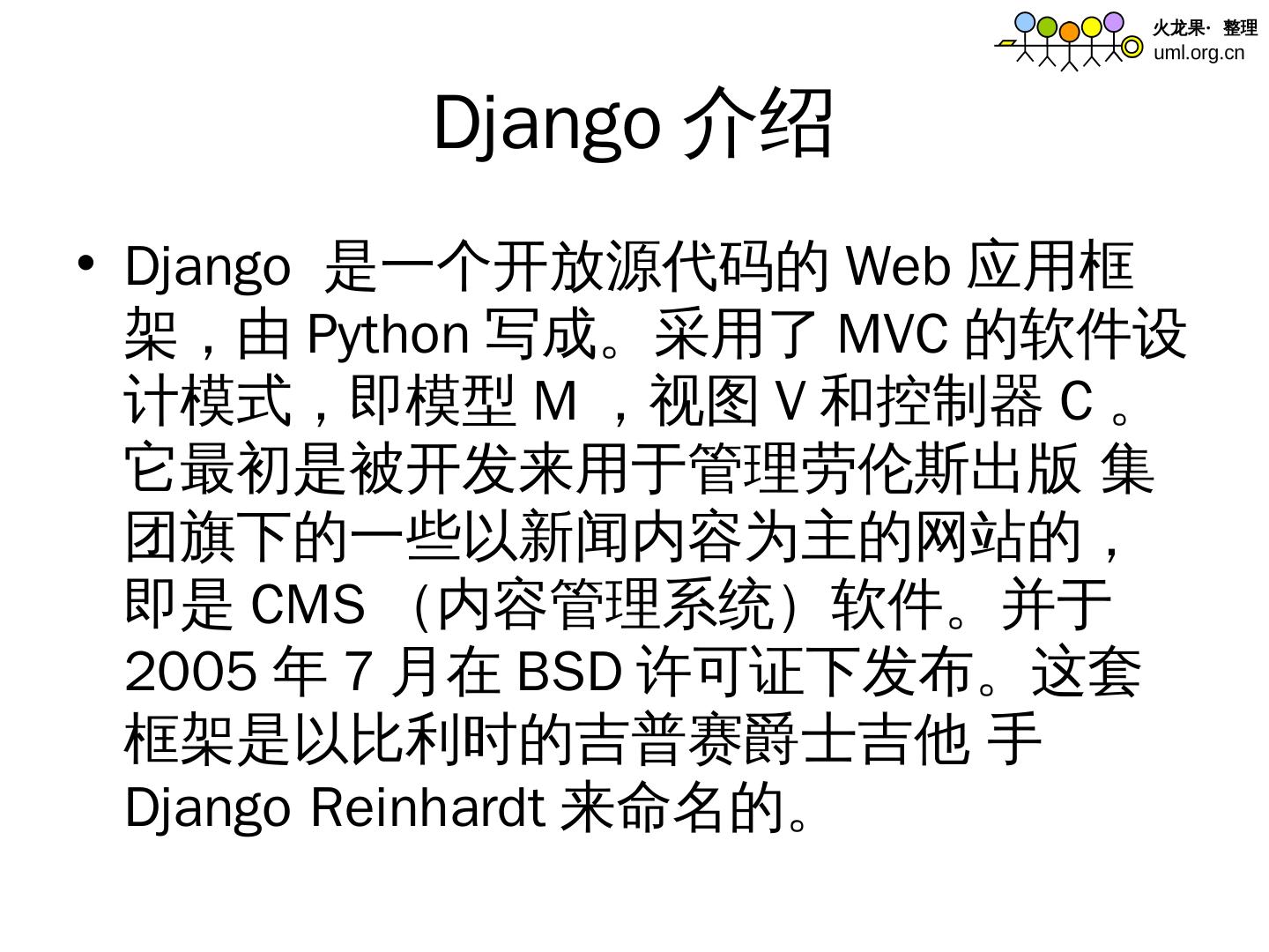 Django 是一个开放源代码的Web应用框架,由Python写成。采用了MVC的软件设计模式,即模型M,视图V和控制器C。它最初是被开发来用于管理劳伦斯出版集团 ...