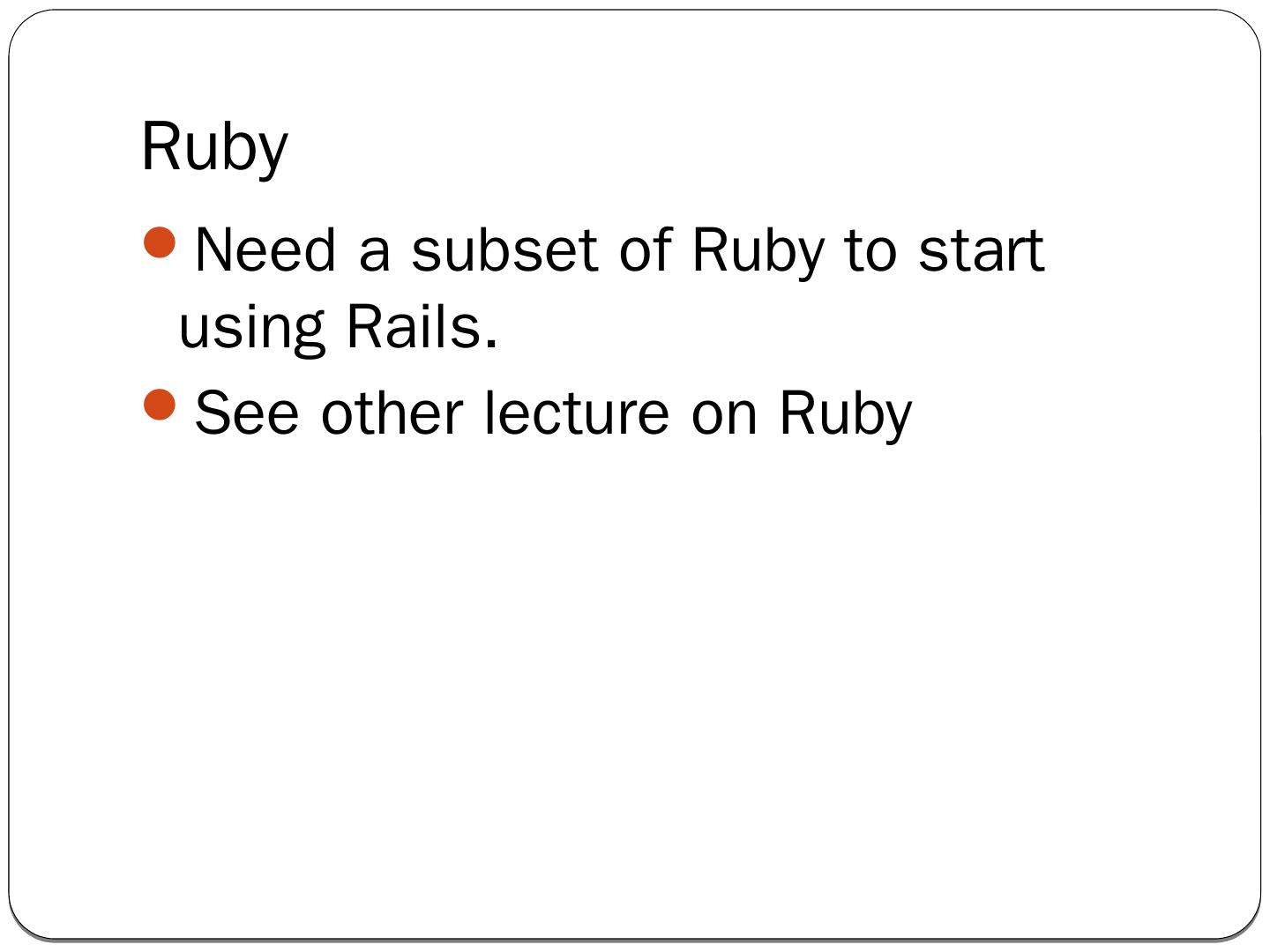 Ruby on Rails is an open source full-stack web framework. It is an alternative to PHP/MySQL. It can render templates, handle user authentication, has built-in ...