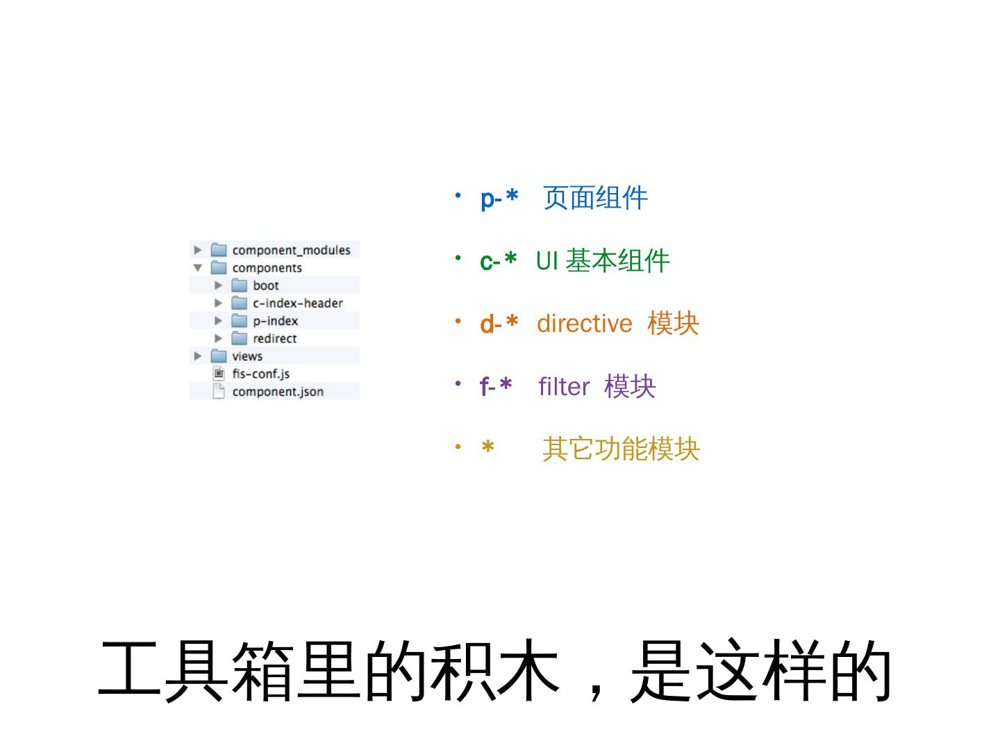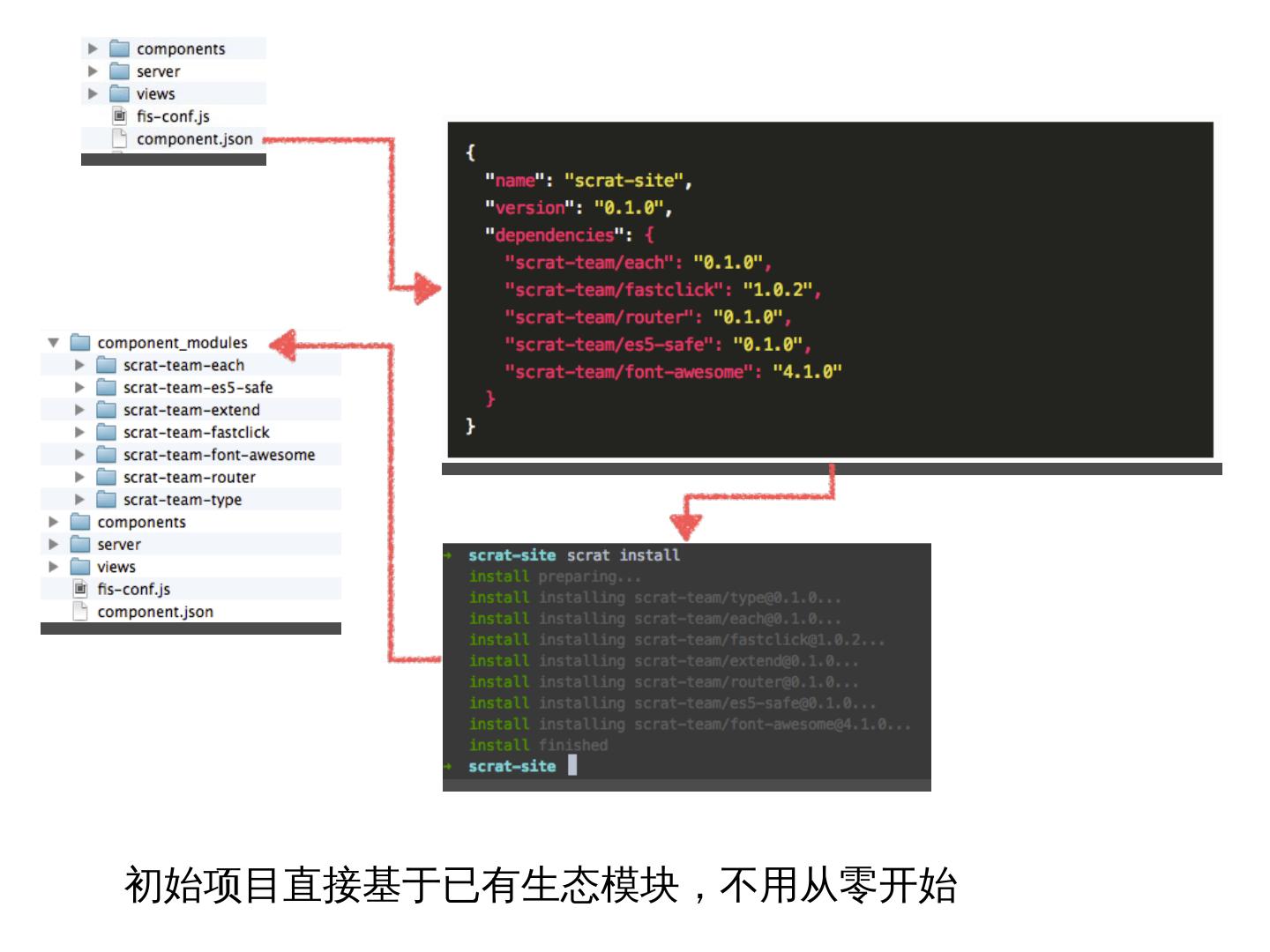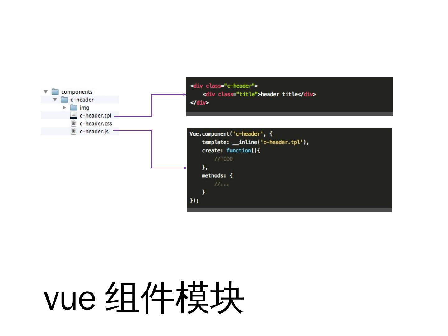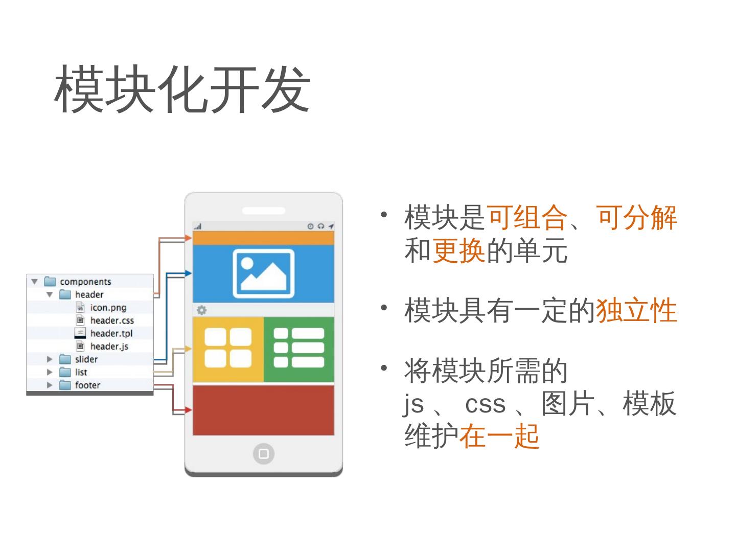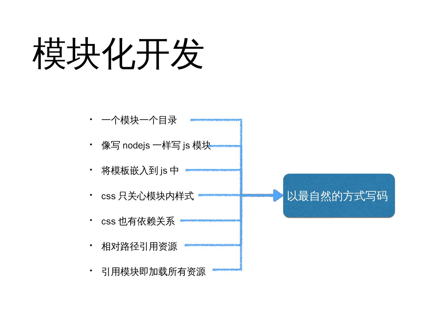 一个模块一个目录; 像写nodejs一样写js模块; 将模板嵌入到js中; css只关心模块内样式; css也有依赖关系; 相对路径引用资源; 引用模块即加载所有资源. 模块化开发.
