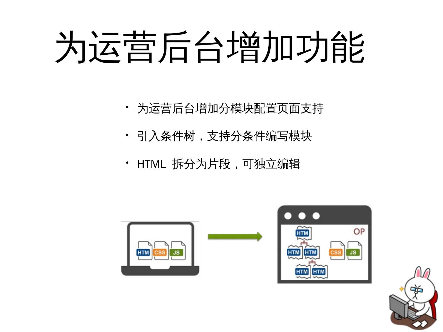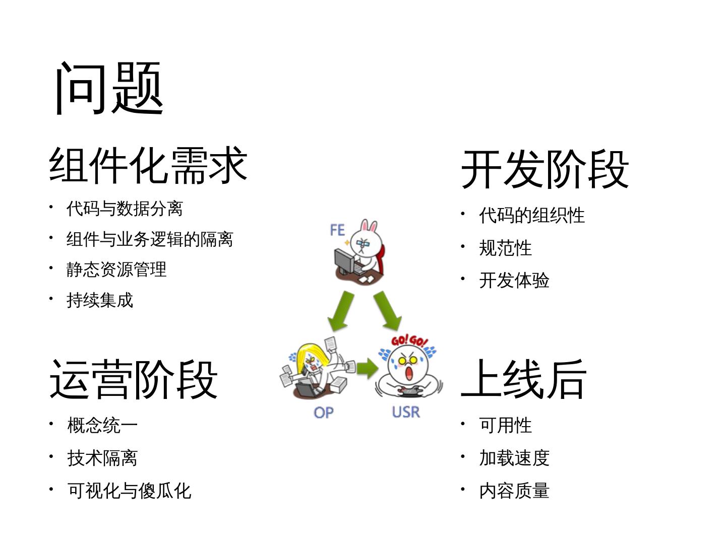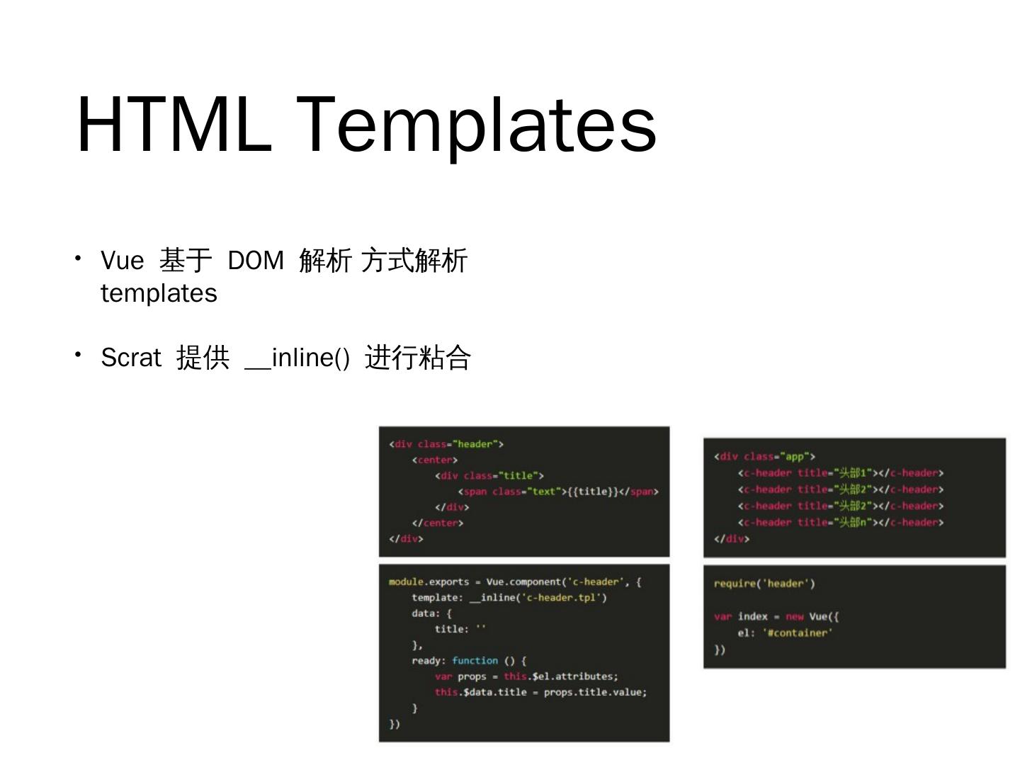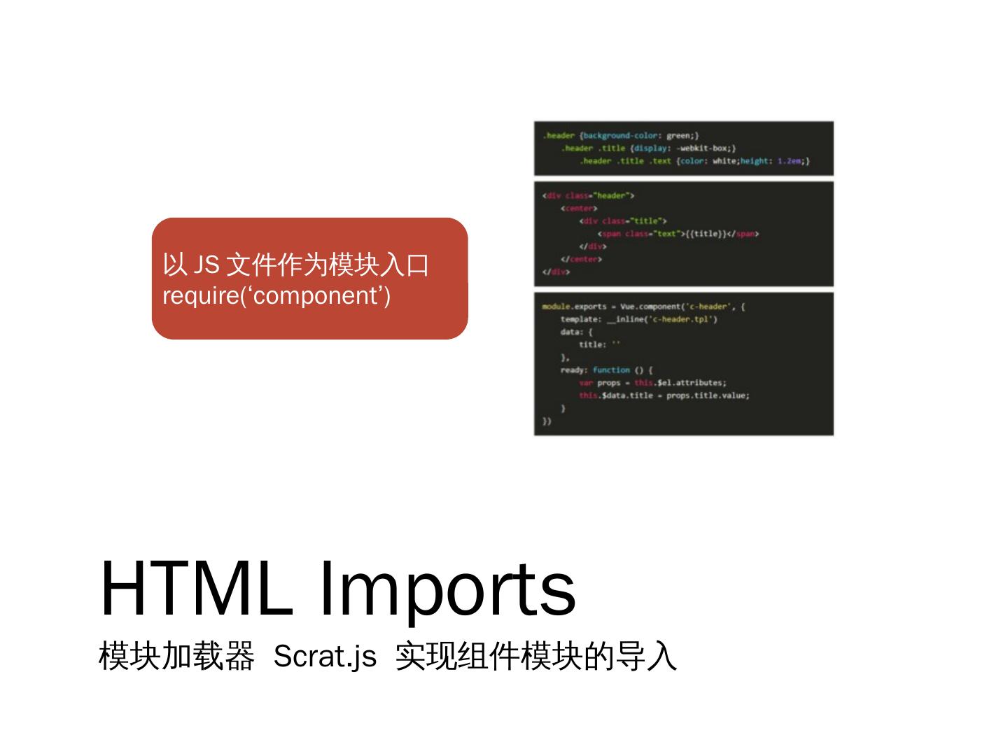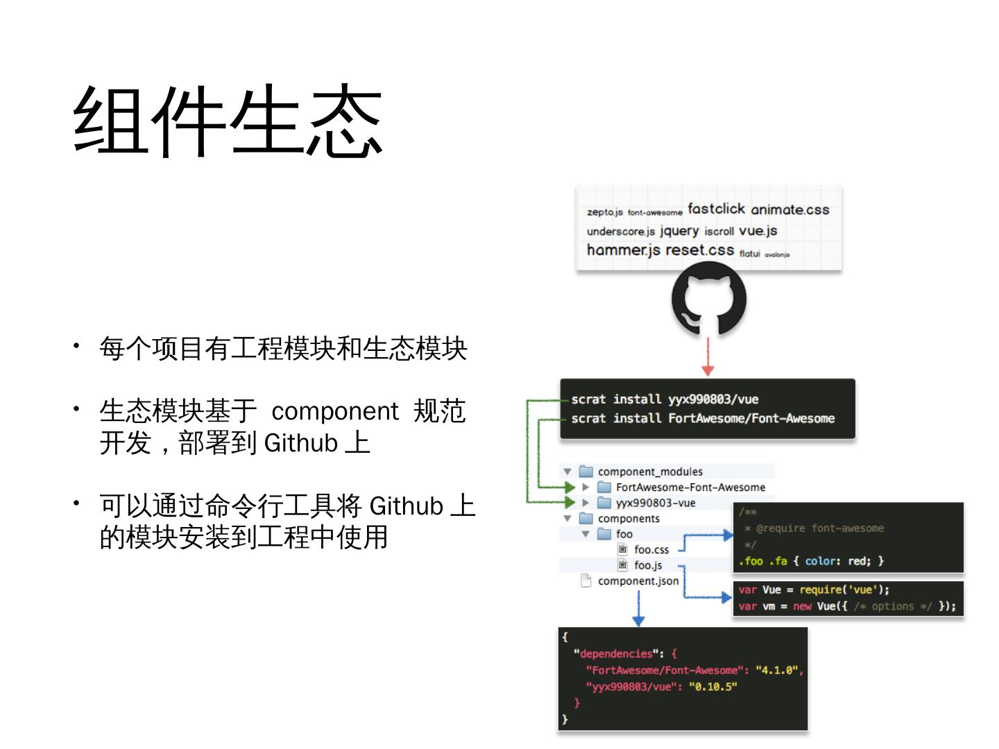 一个模块一个目录; 像写nodejs一样写js模块; 将模板嵌入到js中; css只关心模块内样式; css也有依赖关系; 相对路径引用资源; 引用模块即加载所有资源. 模块化开发.
