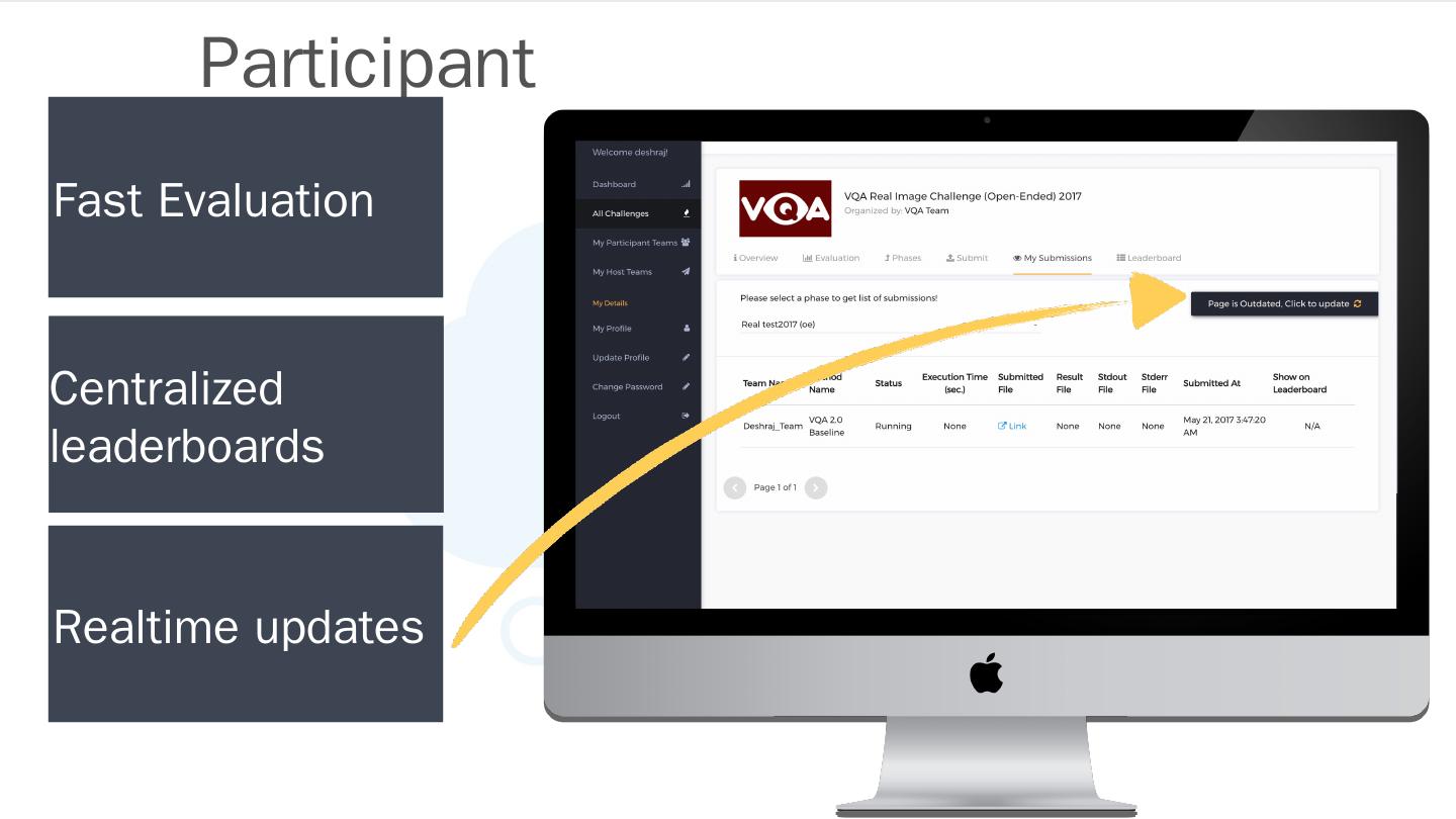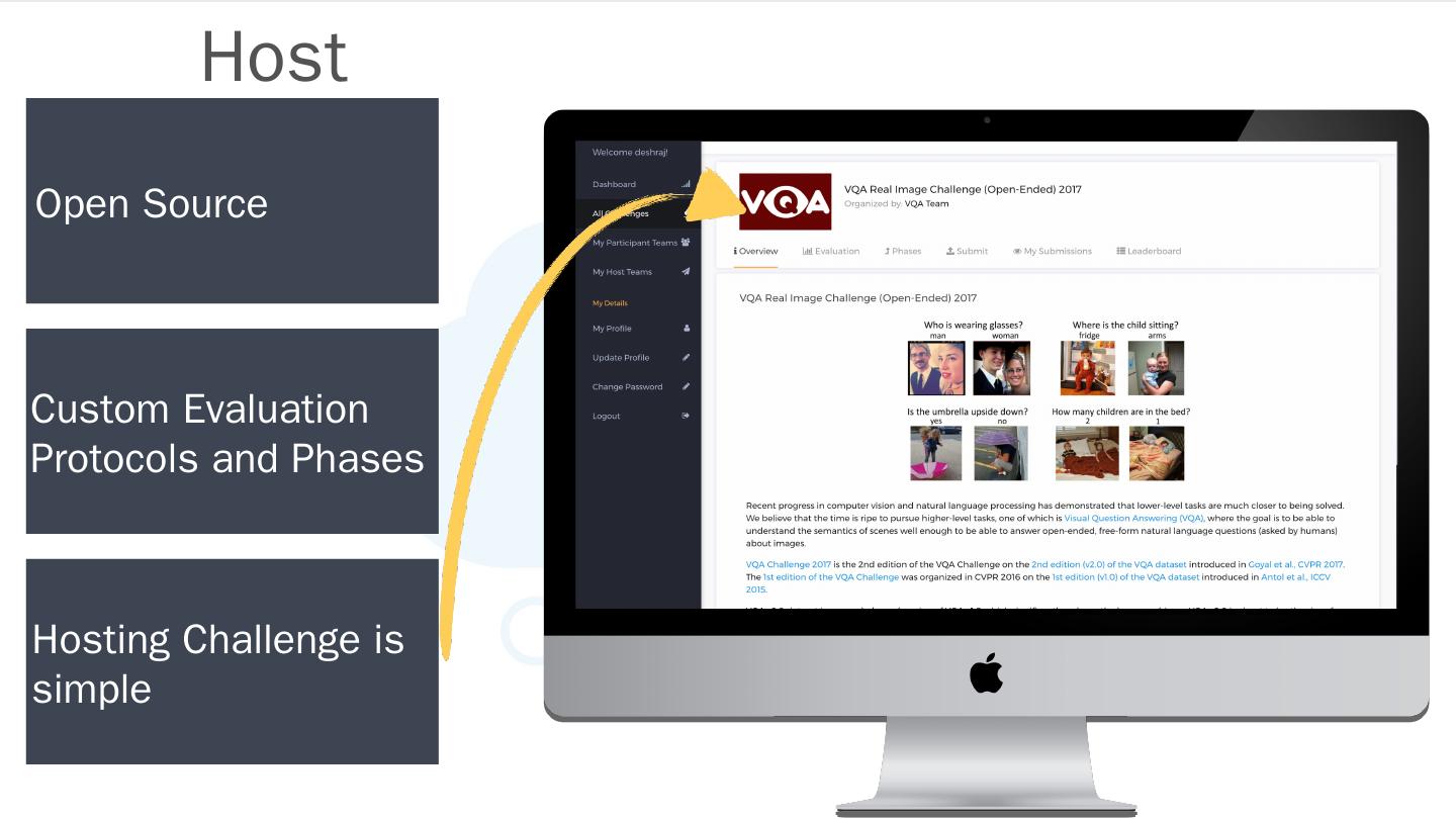 Evaluating state of the art in AI. Team. and 30+ open source ... Benchmarking progress in AI is hard ? What is EvalAI? ... Fast Evaluation. MapReduce Job ...