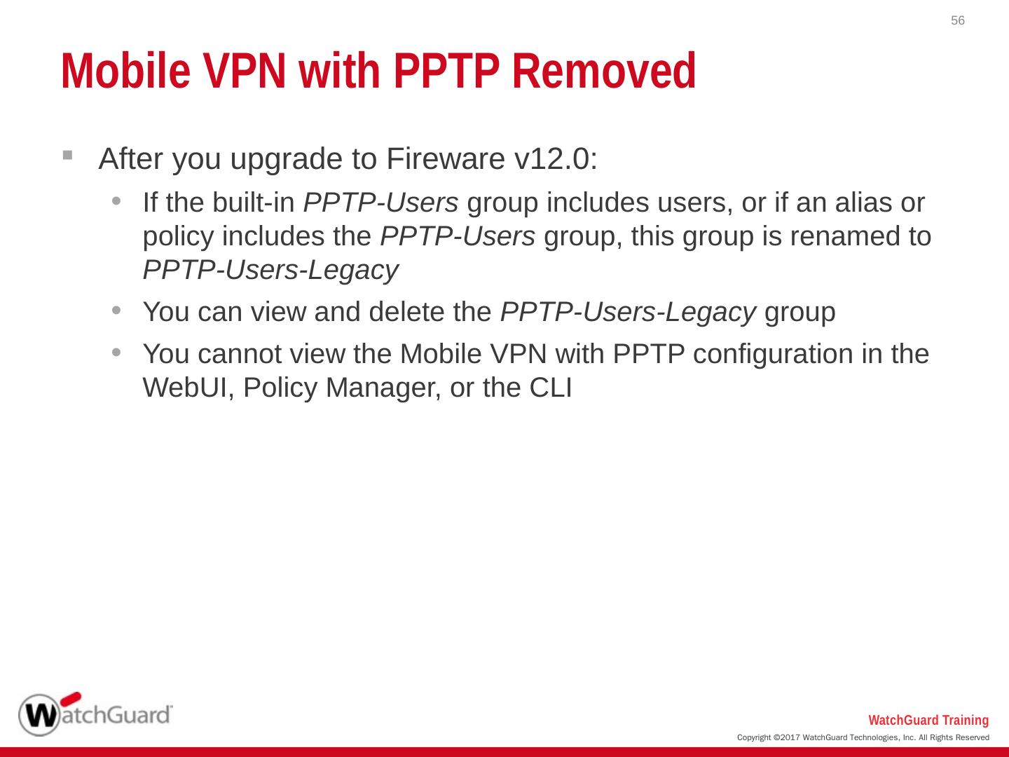 In Fireware v12.0, Mobile VPN with PPTP is no longer available ... information, see How do I migrate from PPTP to L2TP? in the WatchGuard Knowledge Base.