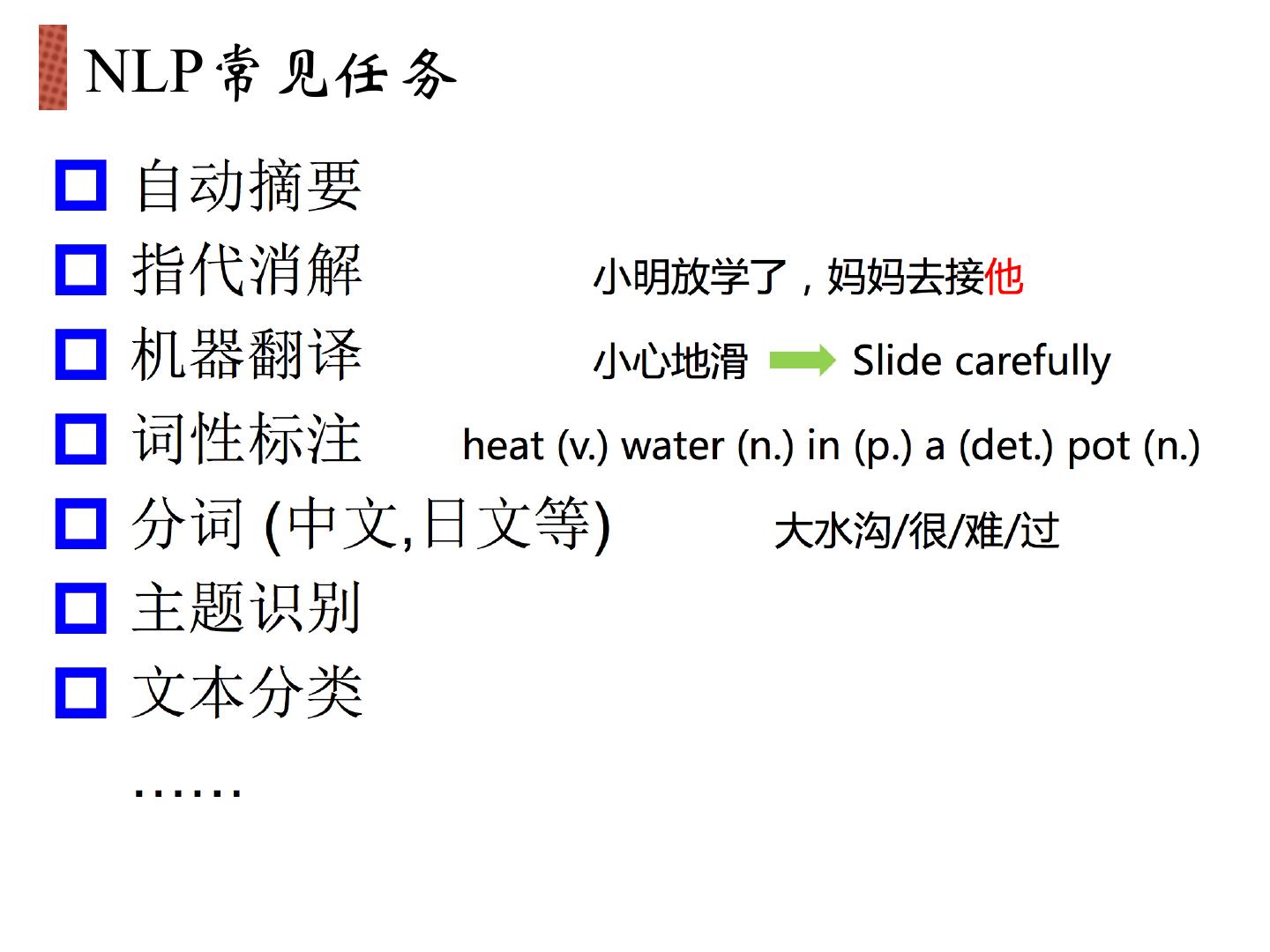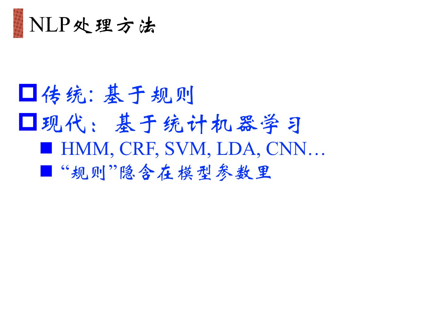 3 .NLP处理方法 p 传统: 基于规则 p 现代:基于统计机器学习 n HMM, CRF, SVM, LDA, CNN… n “规则”隐含在模型参数里