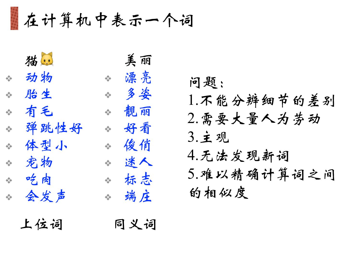 7 . 在计算机中表示一个词 猫🐱 美丽 ❖ 动物 ❖ 漂亮 问题: ❖ 胎生 ❖ 多姿 1. 不能分辨细节的差别 ❖ 有毛 ❖ 靓丽 2. 需要大量人为劳动 ❖ 弹跳性好 ❖ 好看 俊俏 3. 主观 ❖ 体型小 ❖ ❖ 宠物 ❖ 迷人 4. 无法发现新词 ❖ 吃肉 ❖ 标志 5. 难以精确计算词之间 ❖ 会发声 ❖ 端庄 的相似度 上位词 同义词