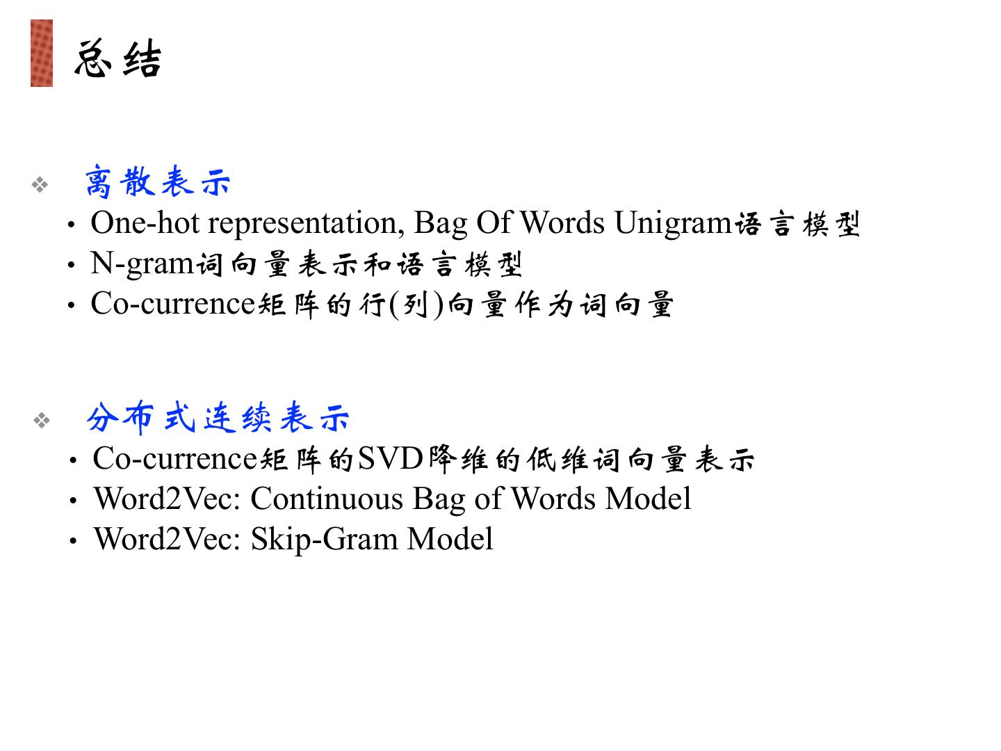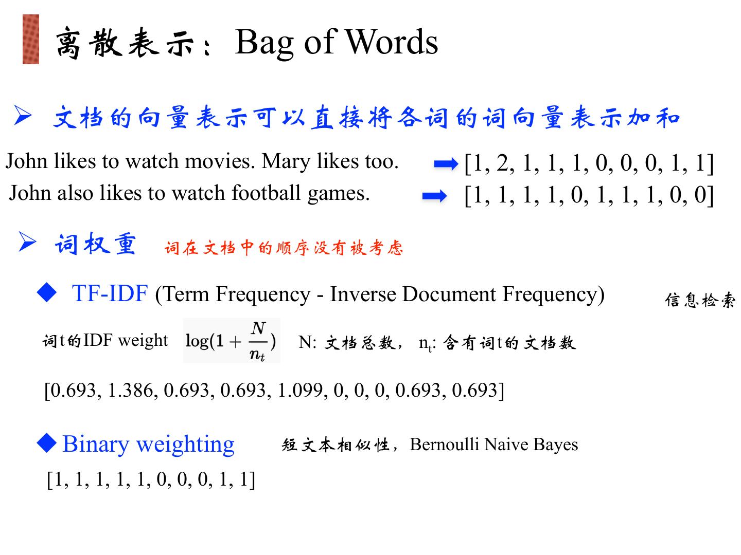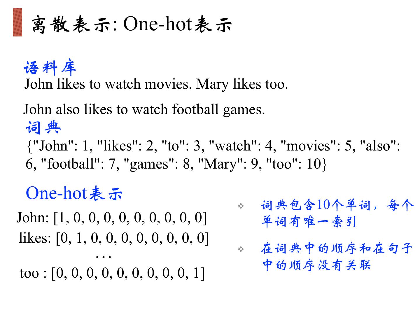 8 . 离散表示: One-hot表示 语料库 John likes to watch movies. Mary likes too. John also likes to watch football games. 词典 {"John": 1, "likes": 2, "to": 3, "watch": 4, "movies": 5, "also": 6, "football": 7, "games": 8, "Mary": 9, "too": 10} One-hot表示 ❖ 词典包含10个单词,每个 John: [1, 0, 0, 0, 0, 0, 0, 0, 0, 0] 单词有唯一索引 likes: [0, 1, 0, 0, 0, 0, 0, 0, 0, 0] … ❖ 在词典中的顺序和在句子 中的顺序没有关联 too : [0, 0, 0, 0, 0, 0, 0, 0, 0, 1]