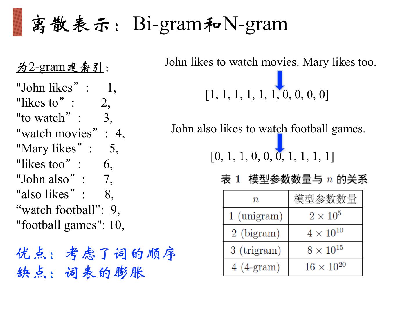 10 . 离散表示:Bi-gram和N-gram 为2-gram建索引: John likes to watch movies. Mary likes too. "John likes”: 1, [1, 1, 1, 1, 1, 1, 0, 0, 0, 0] "likes to”: 2, "to watch”: 3, "watch movies”: 4, John also likes to watch football games. "Mary likes”: 5, [0, 1, 1, 0, 0, 0, 1, 1, 1, 1] "likes too”: 6, "John also”: 7, "also likes”: 8, “watch football”: 9, "football games": 10, 优点:考虑了词的顺序 缺点:词表的膨胀
