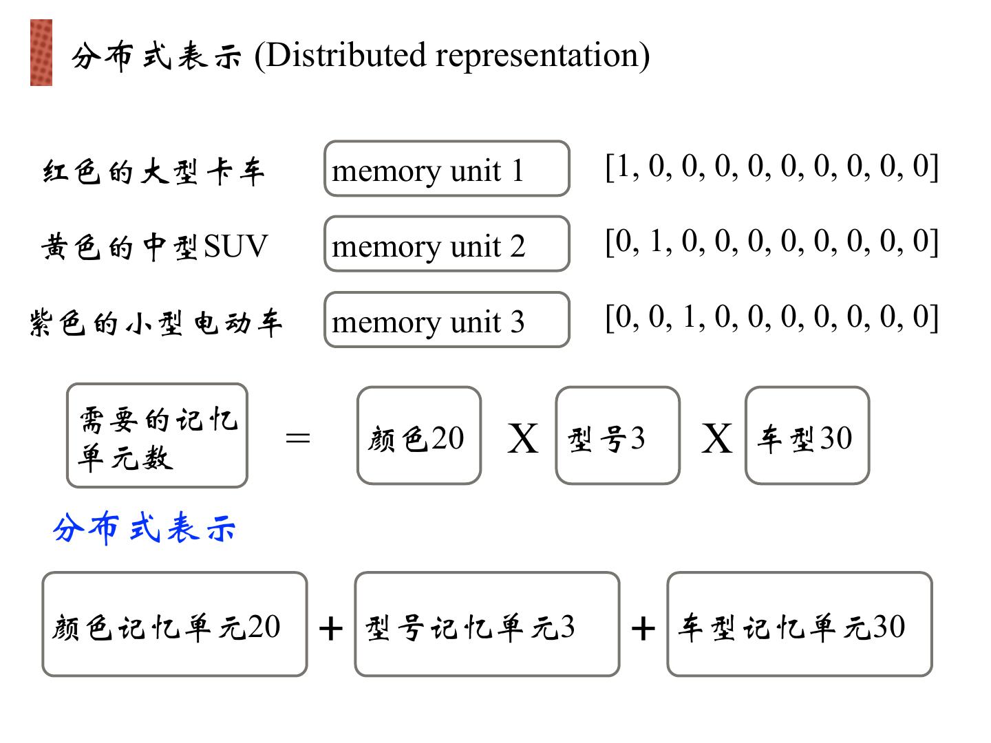 13 . 分布式表示 (Distributed representation) 红色的大型卡车 memory unit 1 [1, 0, 0, 0, 0, 0, 0, 0, 0, 0] 黄色的中型SUV memory unit 2 [0, 1, 0, 0, 0, 0, 0, 0, 0, 0] 紫色的小型电动车 memory unit 3 [0, 0, 1, 0, 0, 0, 0, 0, 0, 0] 需要的记忆 单元数 = 颜色20 X 型号3 X 车型30 分布式表示 颜色记忆单元20 + 型号记忆单元3 + 车型记忆单元30
