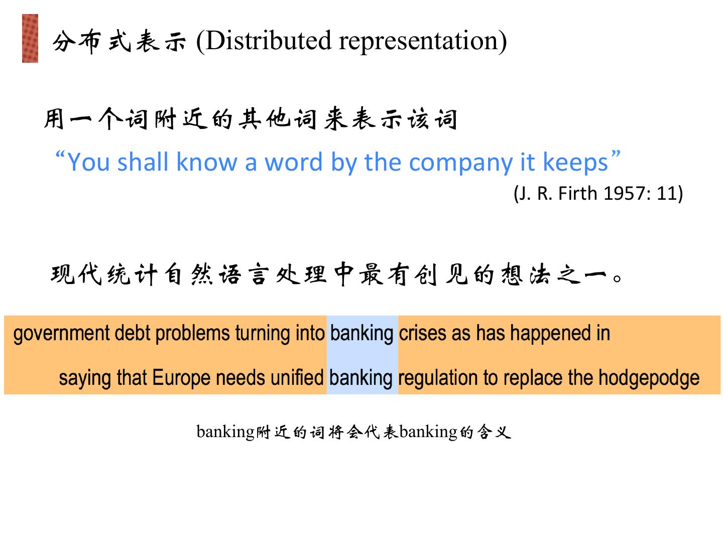 14 . 分布式表示 (Distributed representation) 用一个词附近的其他词来表示该词 “You shall know a word by the company it keeps” (J. R. Firth 1957: 11) 现代统计自然语言处理中最有创见的想法之一。 banking附近的词将会代表banking的含义