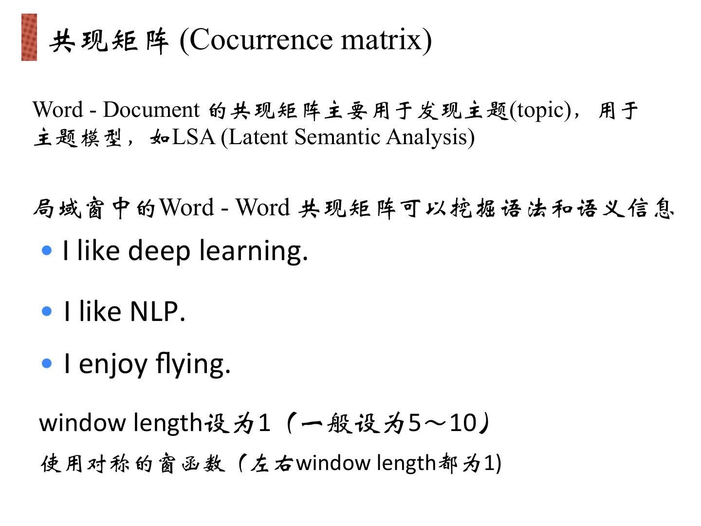 15 . 共现矩阵 (Cocurrence matrix) Word - Document 的共现矩阵主要用于发现主题(topic),用于 主题模型,如LSA (Latent Semantic Analysis) 局域窗中的Word - Word 共现矩阵可以挖掘语法和语义信息 • I like deep learning. • I like NLP. • I enjoy flying. window length设为1(一般设为5~10) 使用对称的窗函数(左右window length都为1)