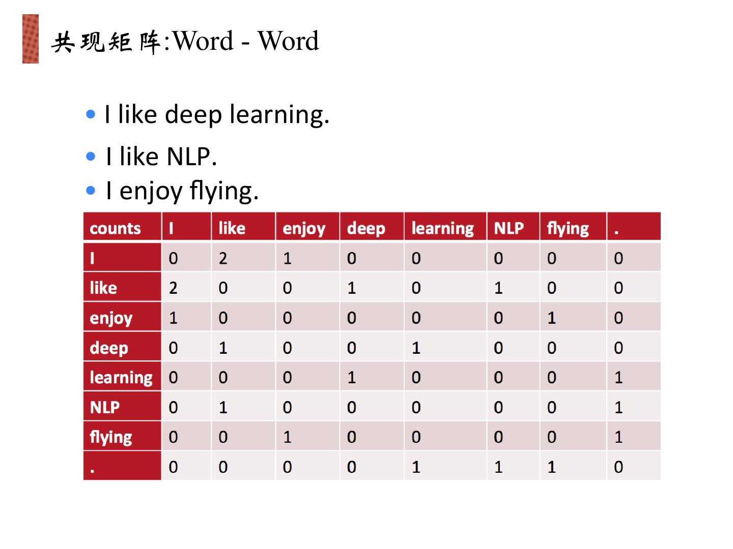 16 .共现矩阵:Word - Word • I like deep learning. • I like NLP. • I enjoy flying.