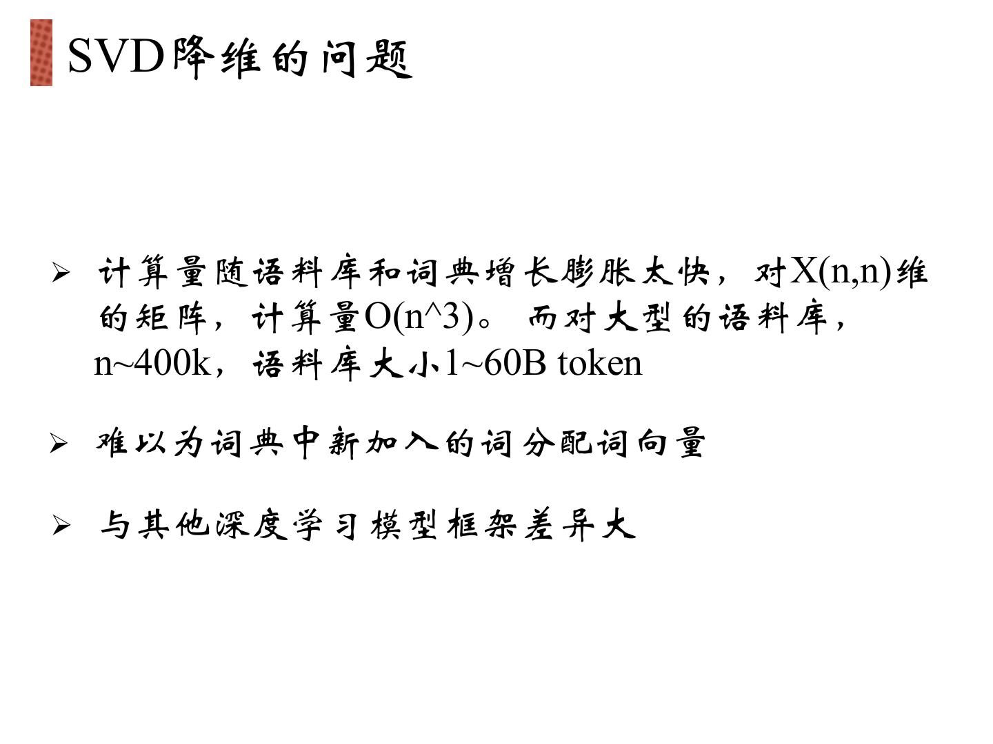 20 . SVD降维的问题 Ø 计算量随语料库和词典增长膨胀太快,对X(n,n)维 的矩阵,计算量O(n^3)。 而对大型的语料库, n~400k,语料库大小1~60B token Ø 难以为词典中新加入的词分配词向量 Ø 与其他深度学习模型框架差异大