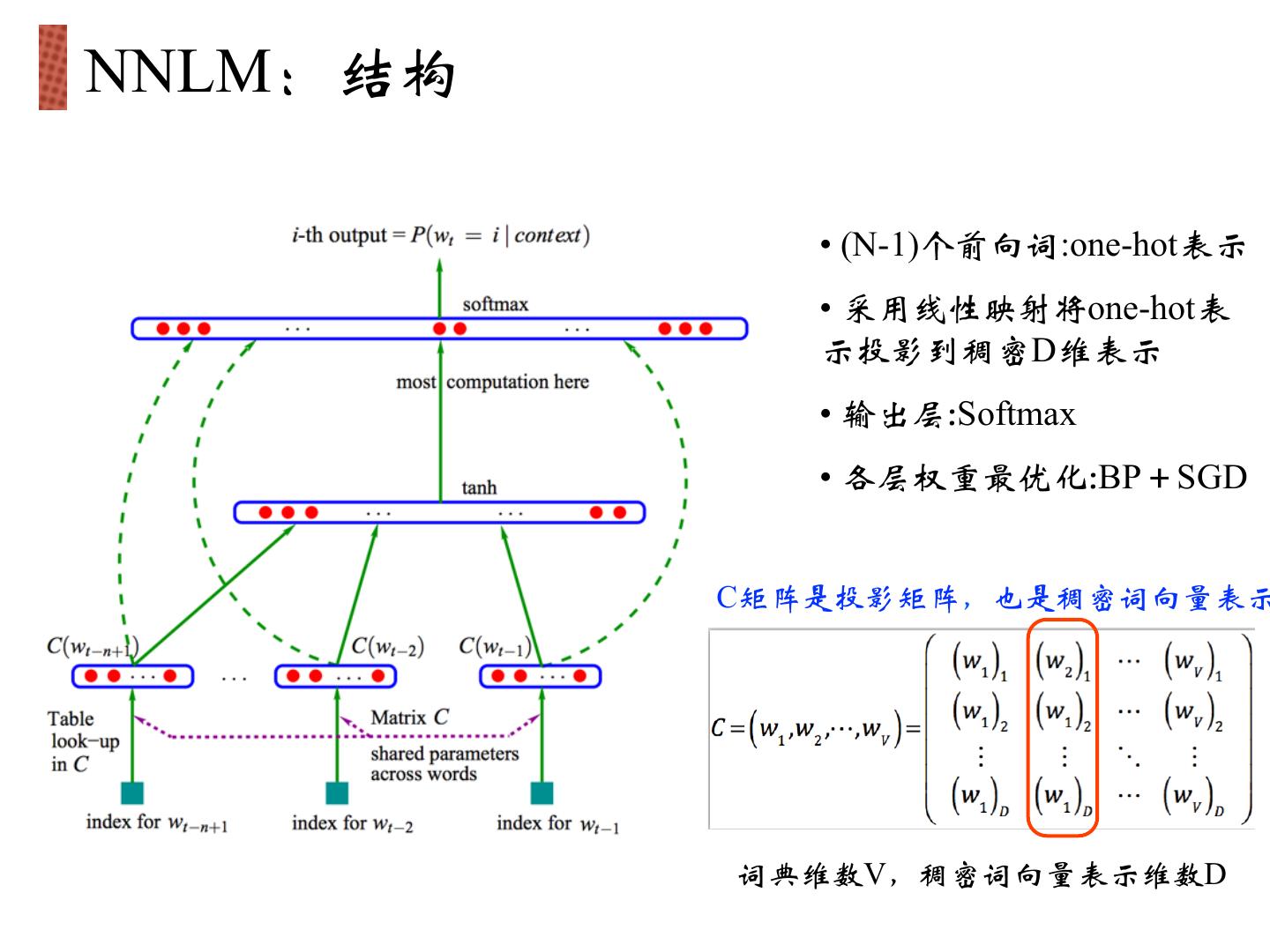 22 .NNLM:结构 • (N-1)个前向词:one-hot表示 • 采用线性映射将one-hot表 示投影到稠密D维表示 • 输出层:Softmax • 各层权重最优化:BP+SGD C矩阵是投影矩阵,也是稠密词向量表示 词典维数V,稠密词向量表示维数D