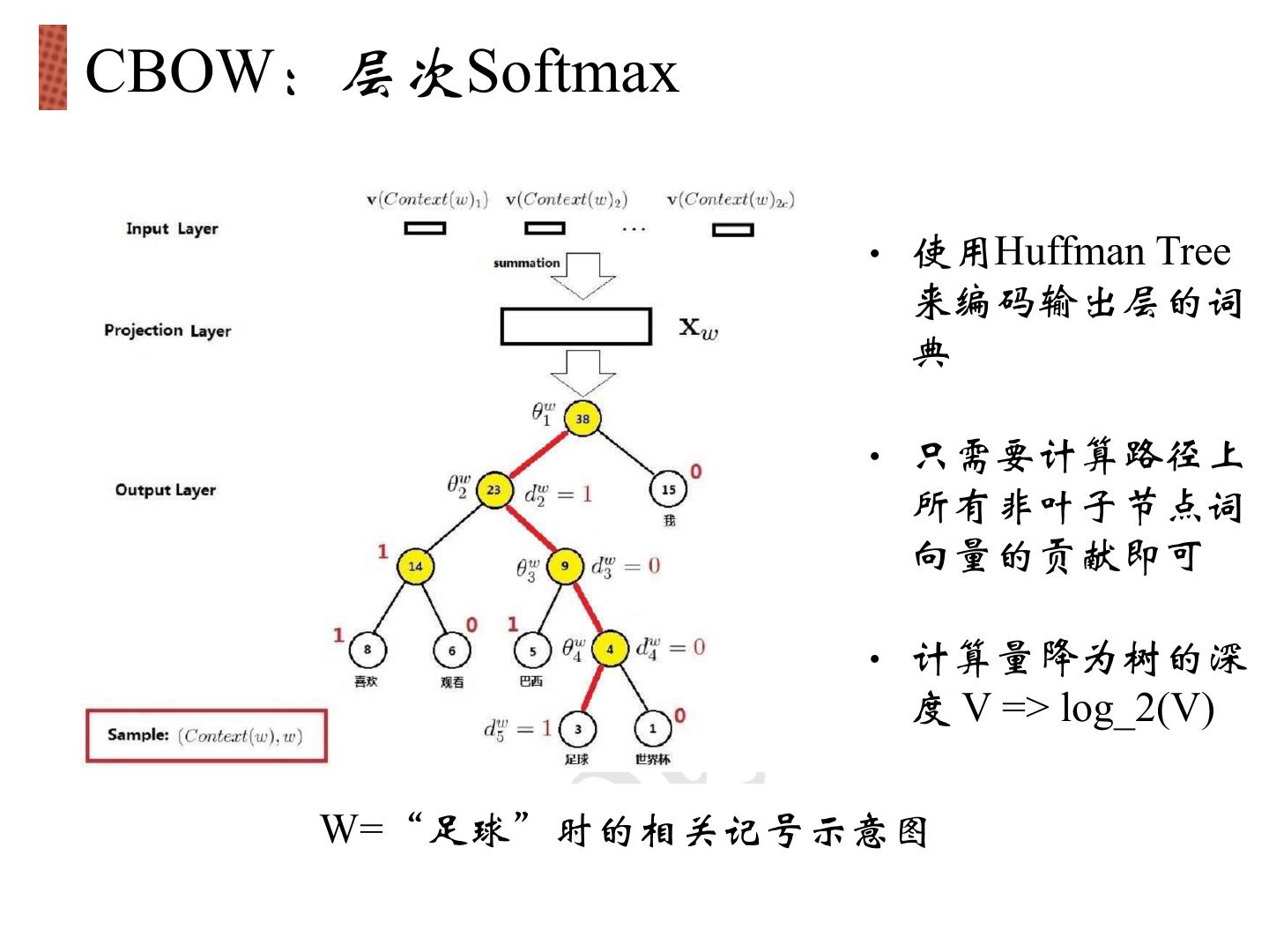 25 .CBOW:层次Softmax • 使用Huffman Tree 来编码输出层的词 典 • 只需要计算路径上 所有非叶子节点词 向量的贡献即可 • 计算量降为树的深 度 V => log_2(V) W=“足球”时的相关记号示意图