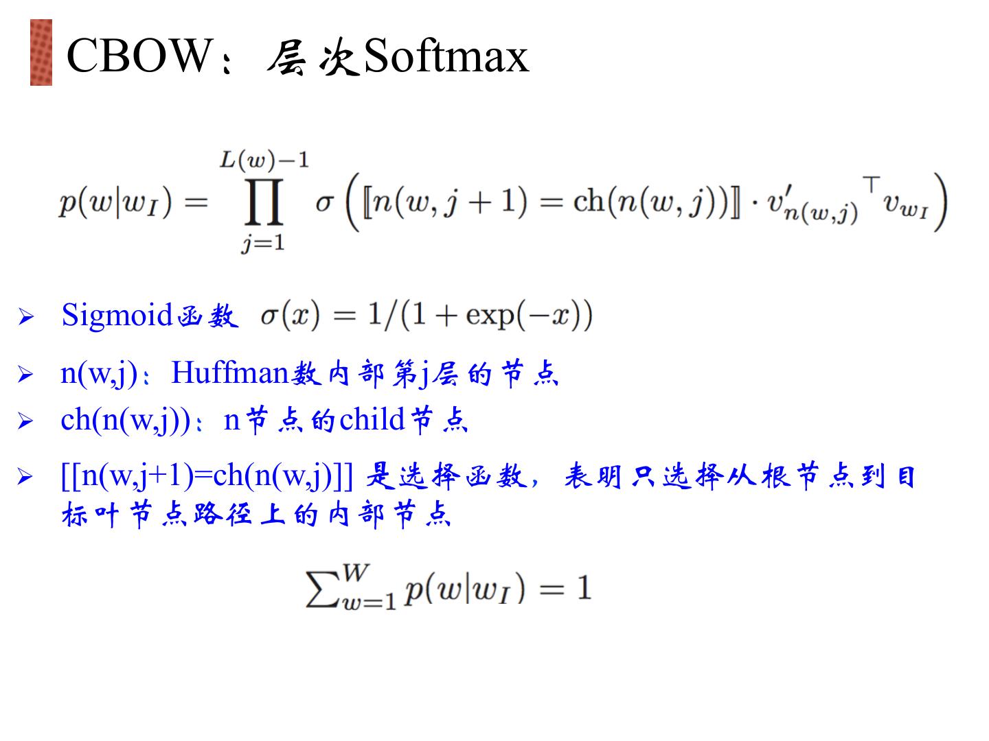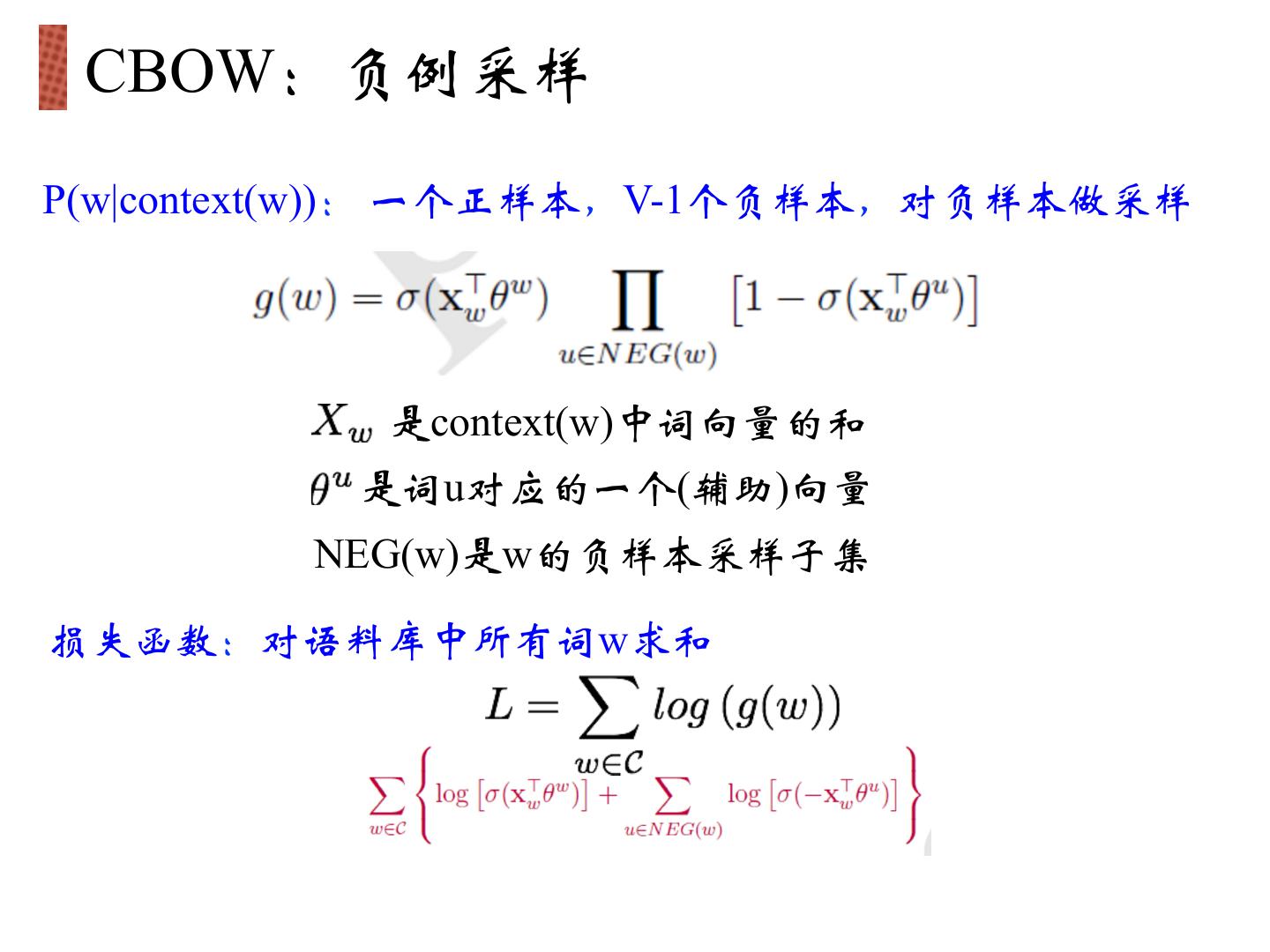 27 . CBOW:负例采样 P(w|context(w)): 一个正样本,V-1个负样本,对负样本做采样 是context(w)中词向量的和 是词u对应的一个(辅助)向量 NEG(w)是w的负样本采样子集 损失函数:对语料库中所有词w求和