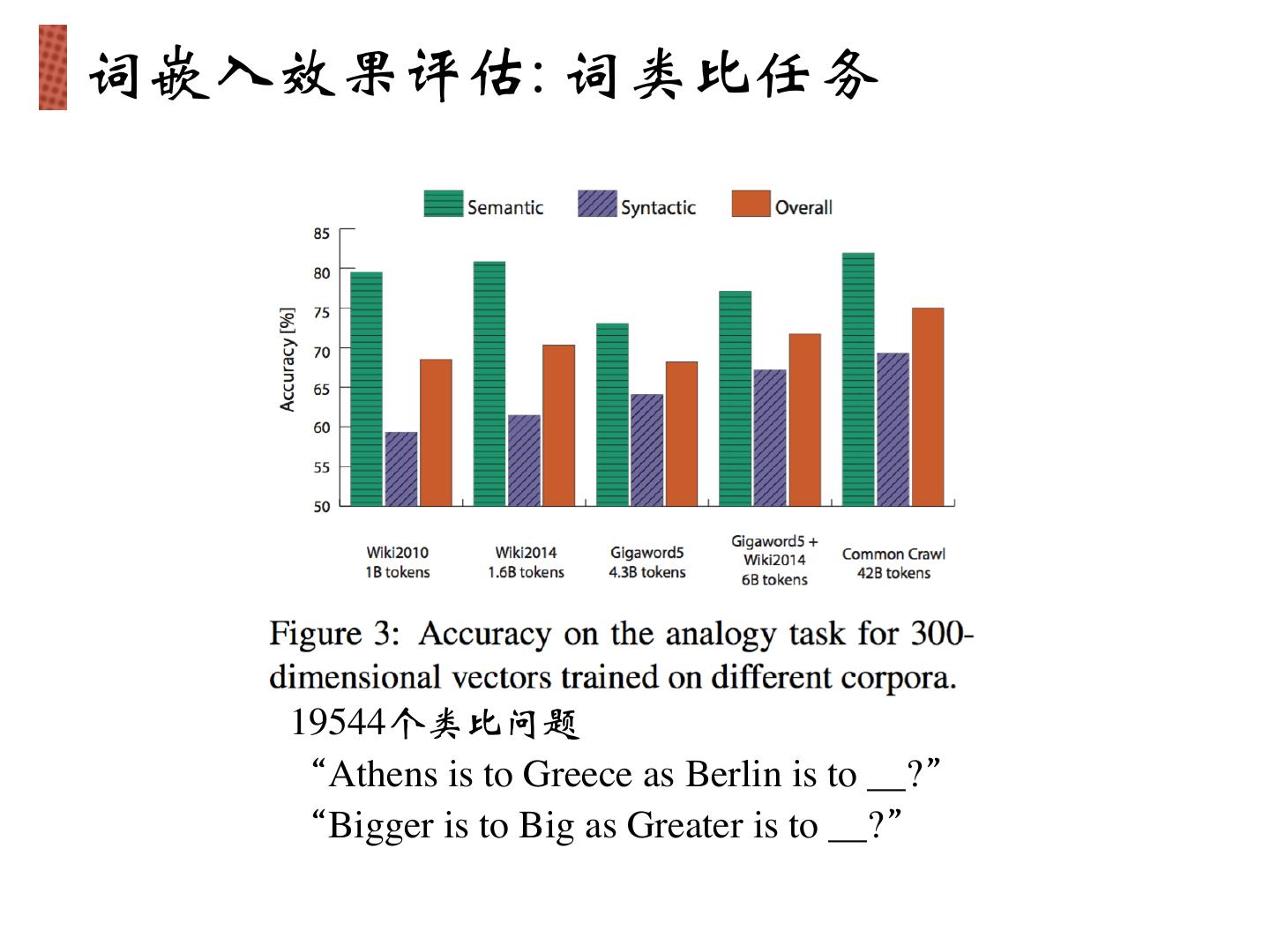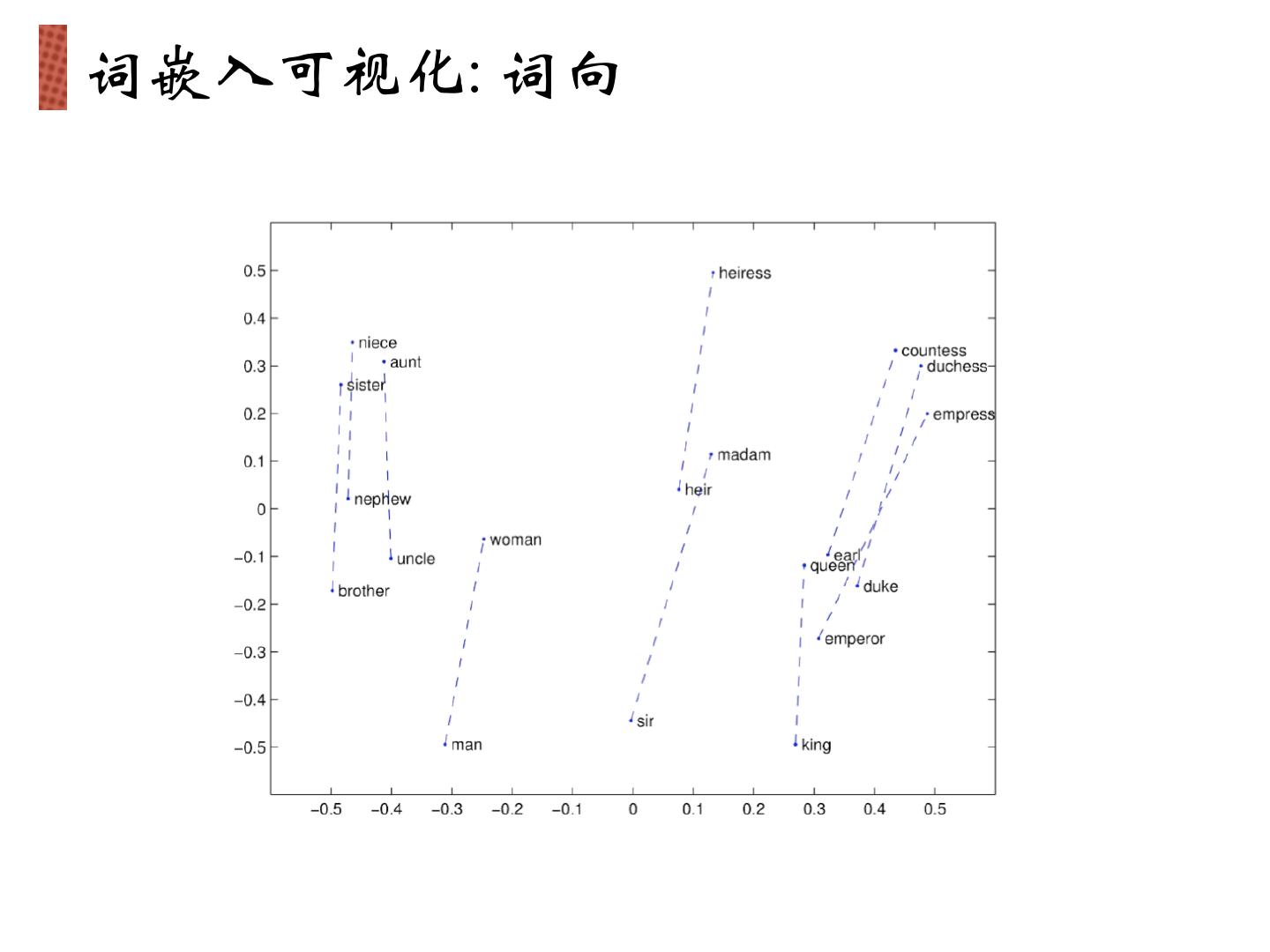 6 . 向量空间子结构 VKing - VQueen + VWomen = VMan VParis - VFrance + VGerman = VBerlin 最终目标:词向量表示作为机器学习、特别是深度学 习的输入和表示空间