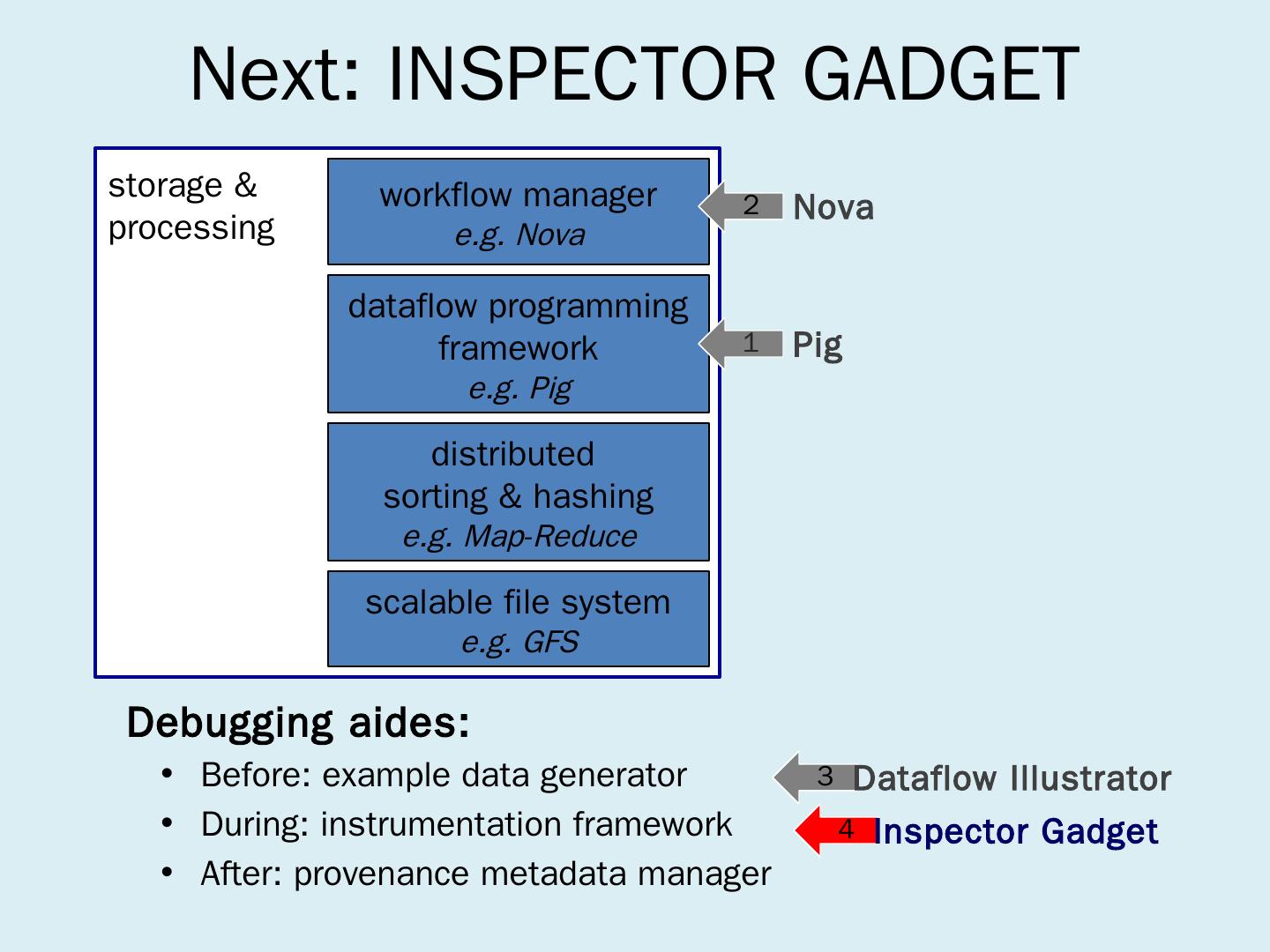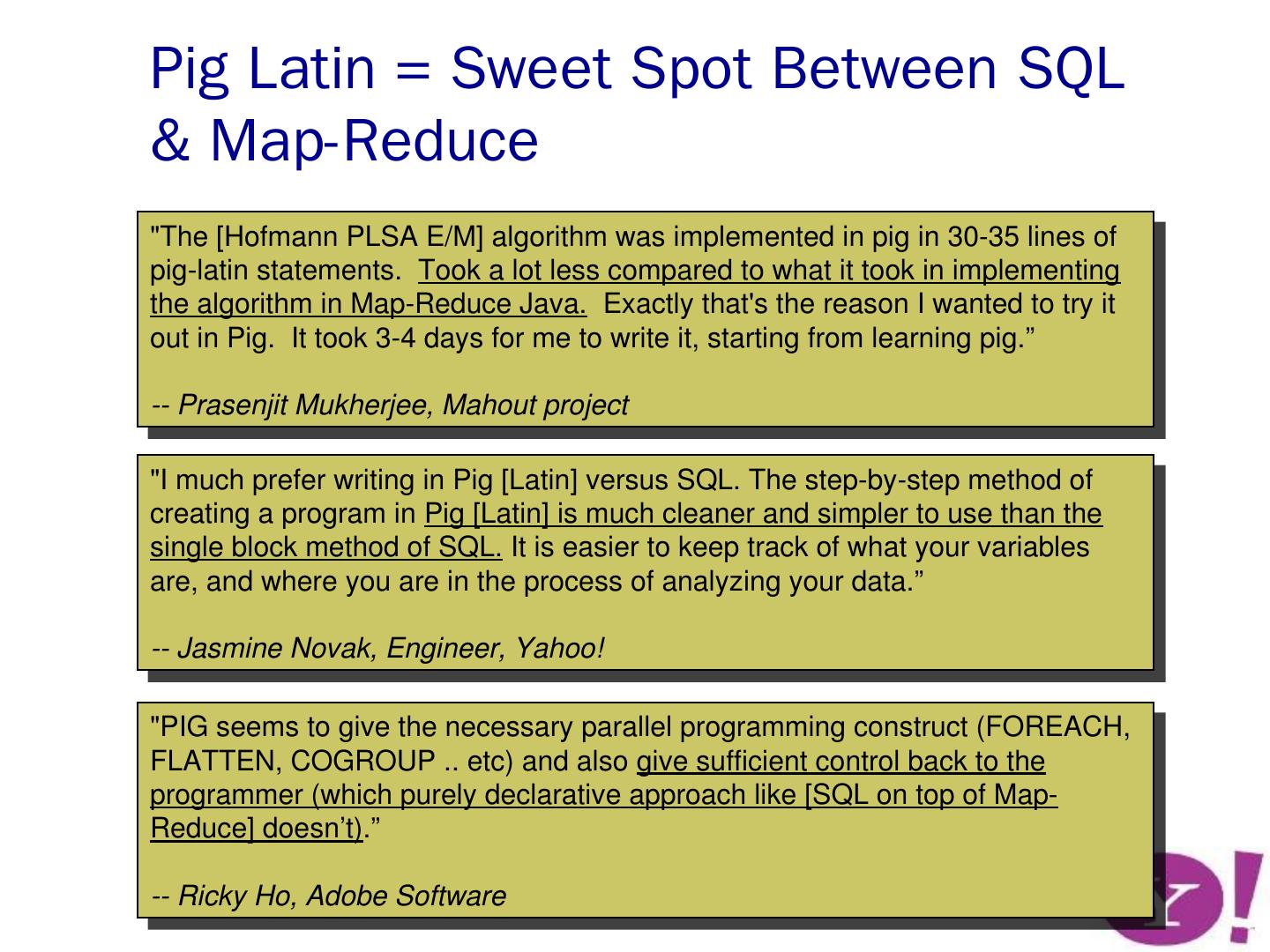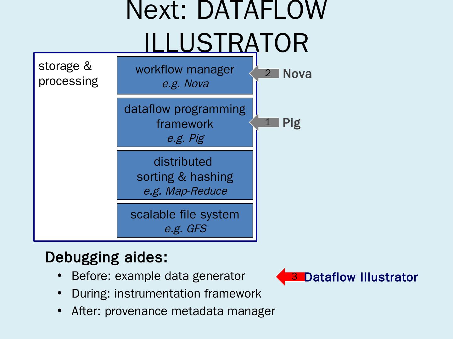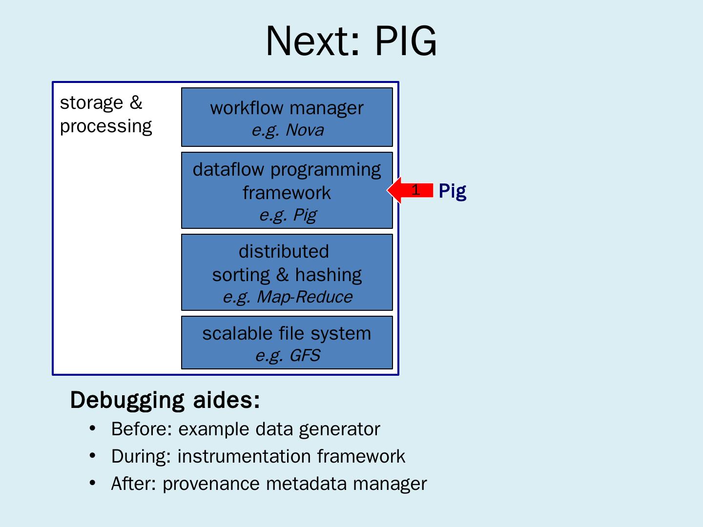 dataflow programming framework. e.g. Pig. workflow manager. e.g. Nova. Pig ... Open-source (the Apache Pig Project); Offered on Amazon Elastic Map-Reduce ...