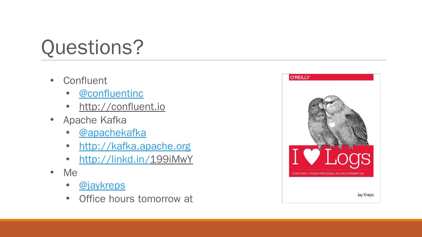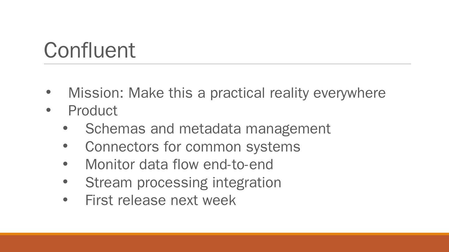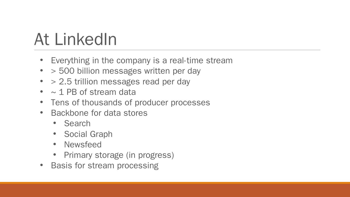 Data Collection and Stream Processing with Apache Kafka. Jay Kreps, Confluent. Experience at LinkedIn. 2009: We want all our data in Hadoop! What is all our ...