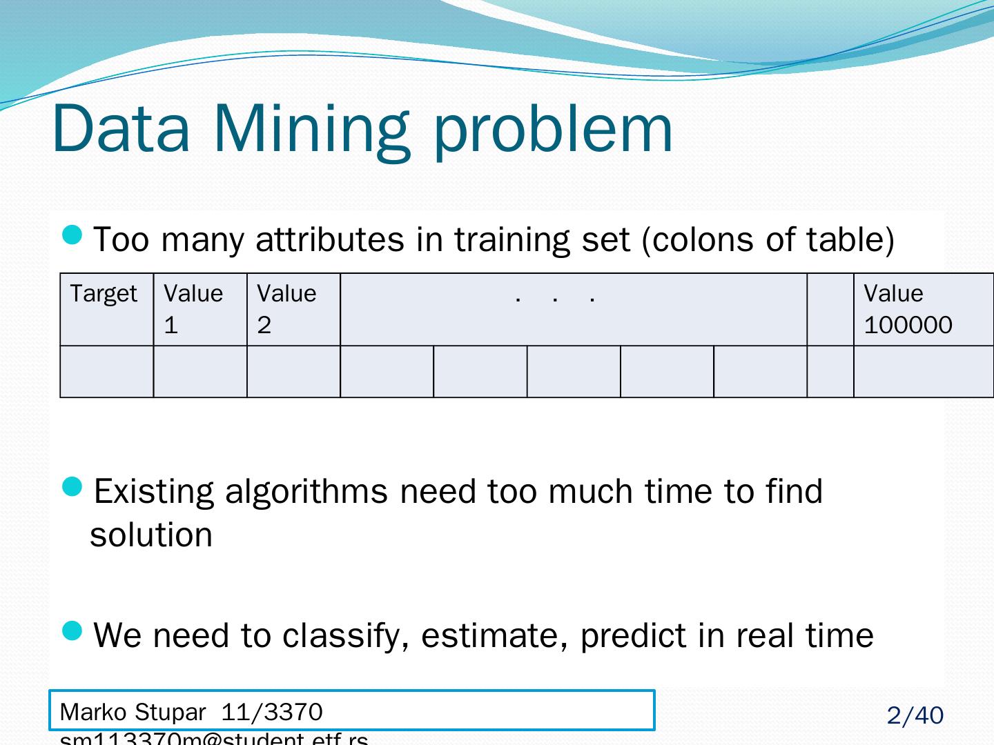 2 .Data Mining problem Too many attributes in training set (colons of table) Existing algorithms need too much time to find solution We need to classify, estimate, predict in real time Marko Stupar 11/3370 sm113370m@student.etf.rs Target Value 1 Value 2 . . . Value 100000 2 /40
