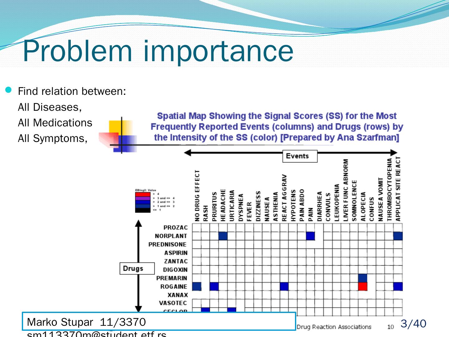 3 .Problem importance Find relation between: All Diseases, All Medications, All Symptoms, Marko Stupar 11/3370 sm113370m@student.etf.rs 3 /40