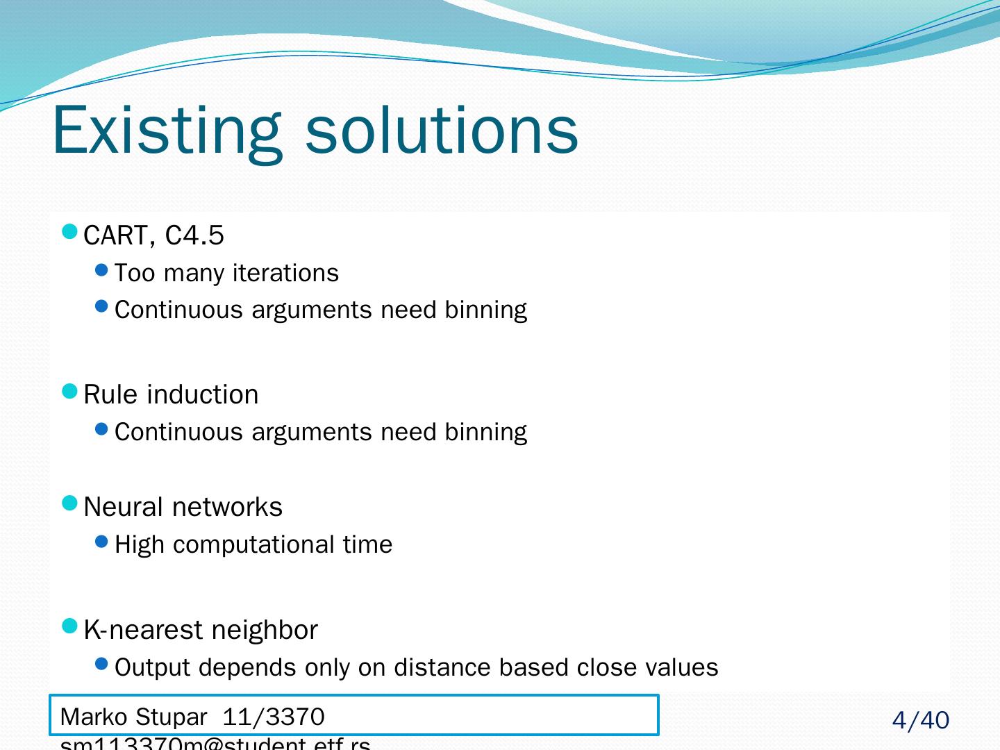 4 .Existing solutions Marko Stupar 11/3370 sm113370m@student.etf.rs CART, C4.5 Too many iterations Continuous arguments need binning Rule induction Continuous arguments need binning Neural networks High computational time K-nearest neighbor Output depends only on distance based close values 4 /40