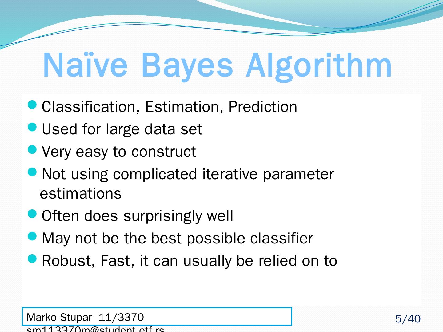5 .Classification, Estimation, Prediction Used for large data set Very easy to construct Not using complicated iterative parameter estimations Often does surprisingly well May not be the best possible classifier Robust, Fast, it can usually be relied on to Marko Stupar 11/3370 sm113370m@student.etf.rs Naïve Bayes Algorithm 5 /40