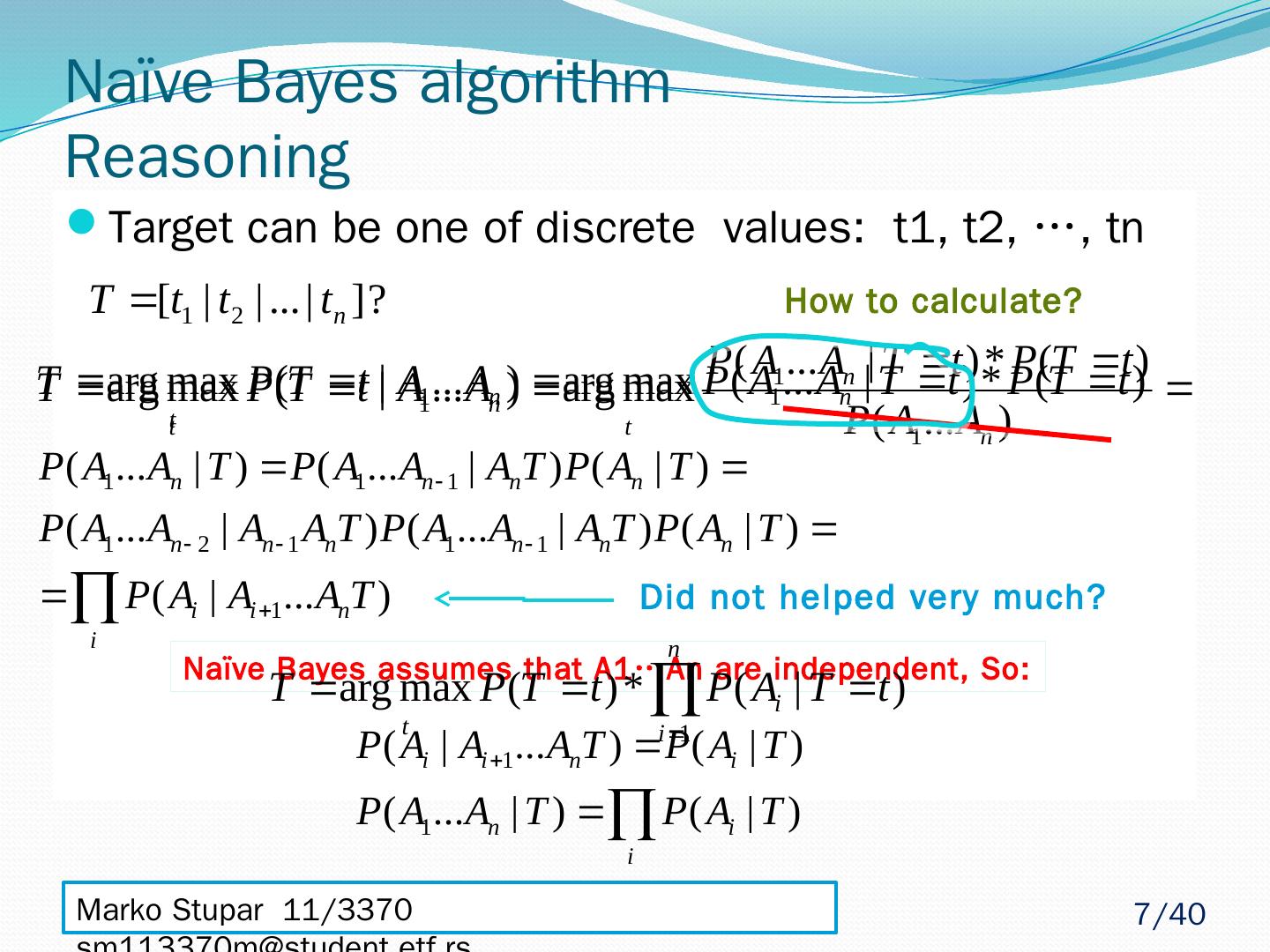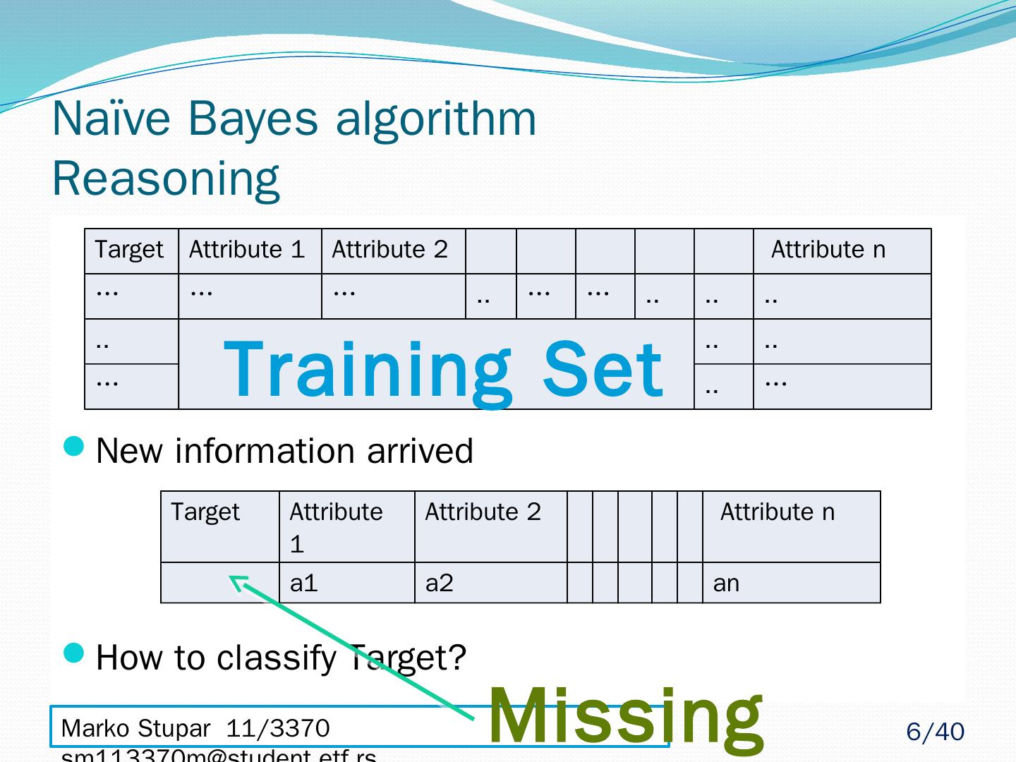 6 .Marko Stupar 11/3370 sm113370m@student.etf.rs Naïve Bayes algorithm Reasoning New information arrived How to classify Target? Target Attribute 1 Attribute 2 Attribute n … … … .. … … .. .. .. .. .. .. … .. … Training Set Target Attribute 1 Attribute 2 Attribute n a1 a2 an Missing 6 /40
