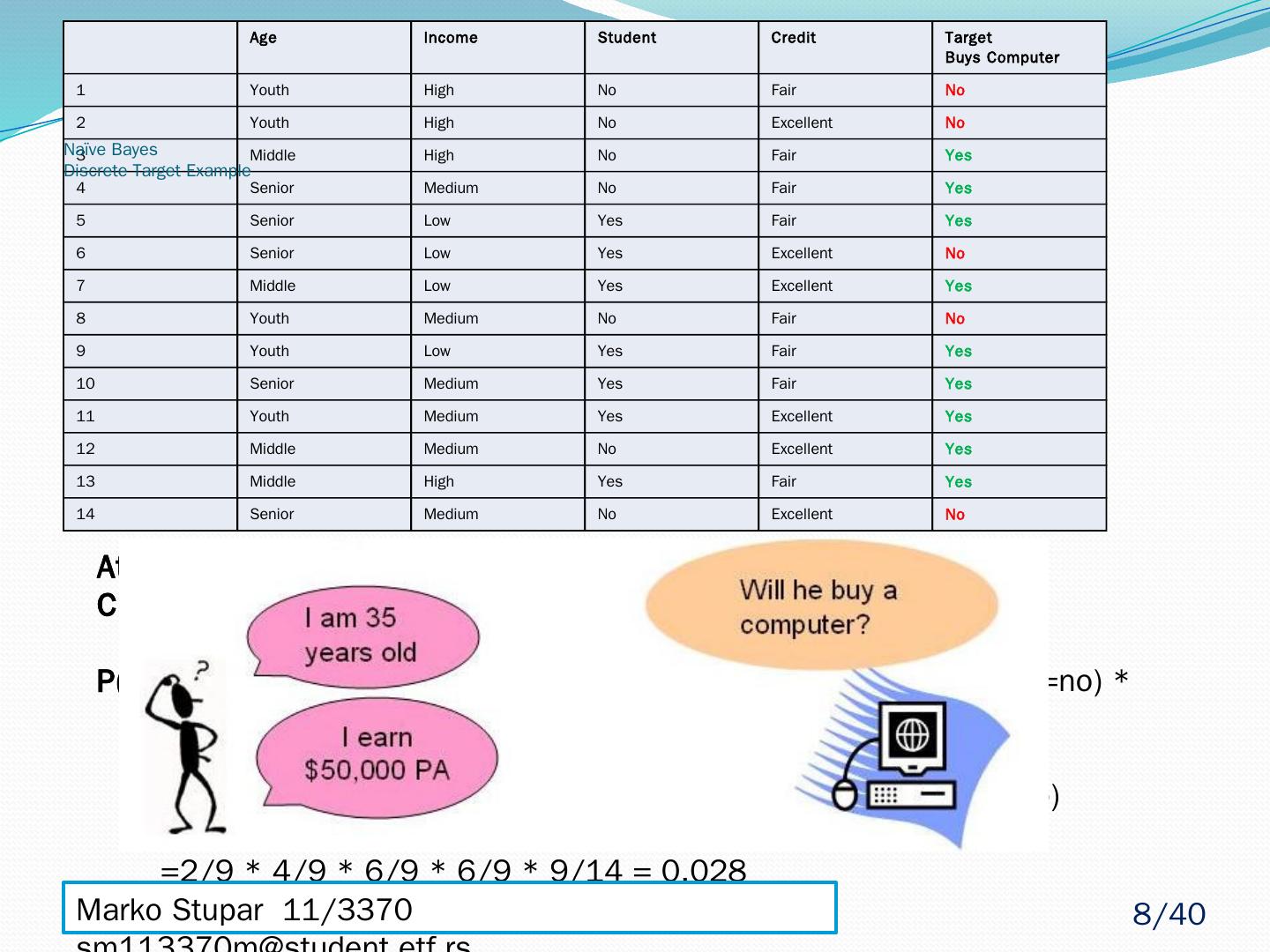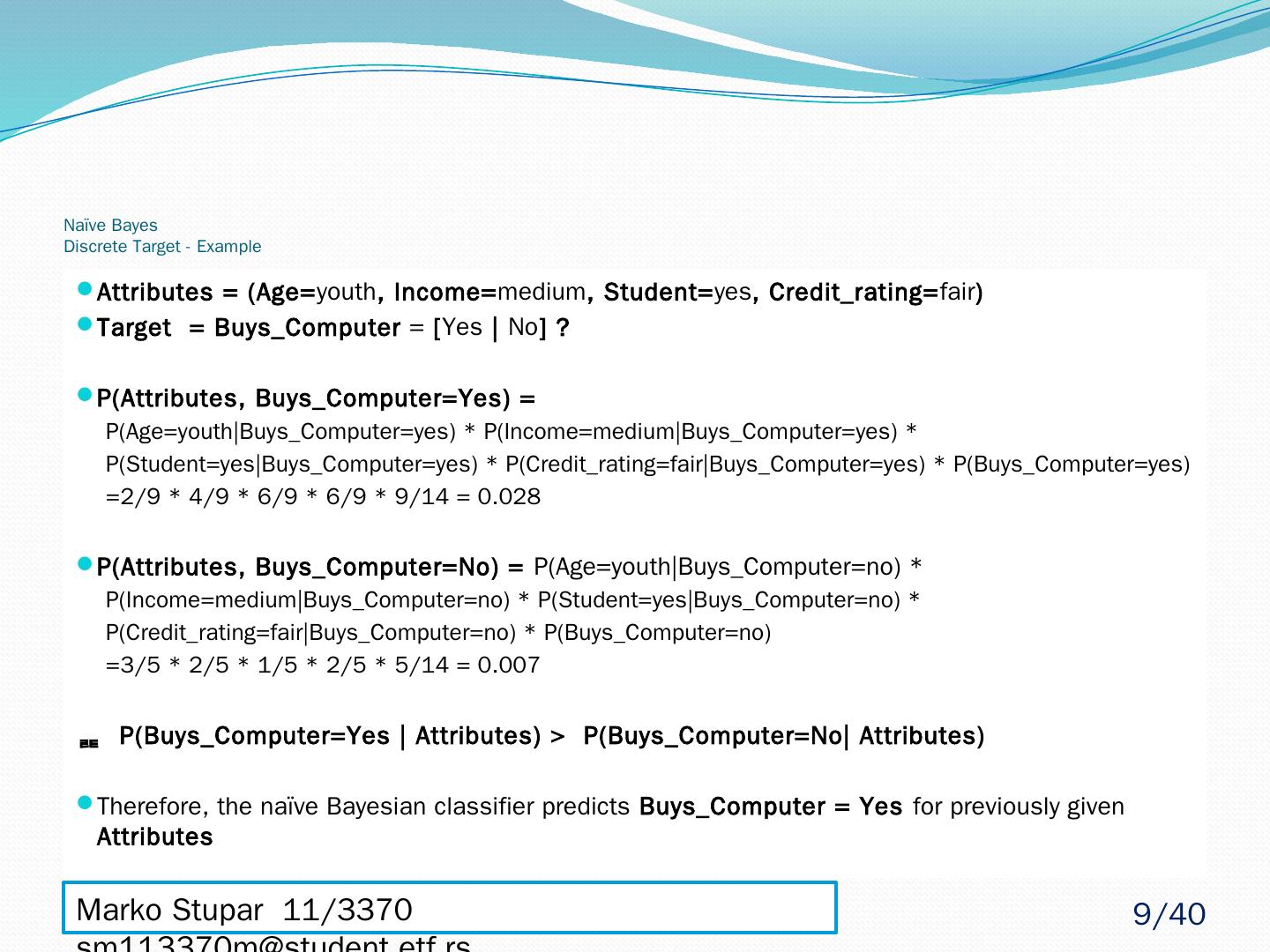 9 .Naïve Bayes Discrete Target - Example Attributes = (Age= youth , Income= medium , Student= yes , Credit_rating = fair ) Target = Buys_Computer = [ Yes | No ] ? P(Attributes, Buys_Computer =Yes) = P(Age= youth|Buys_Computer =yes) * P(Income= medium|Buys_Computer =yes) * P(Student= yes|Buys_Computer =yes) * P( Credit_rating = fair|Buys_Computer =yes) * P( Buys_Computer =yes) =2/9 * 4/9 * 6/9 * 6/9 * 9/14 = 0.028 P(Attributes, Buys_Computer =No) = P(Age= youth|Buys_Computer =no) * P(Income= medium|Buys_Computer =no) * P(Student= yes|Buys_Computer =no) * P( Credit_rating = fair|Buys_Computer =no) * P( Buys_Computer =no) =3/5 * 2/5 * 1/5 * 2/5 * 5/14 = 0.007 P( Buys_Computer =Yes | Attributes) > P( Buys_Computer =No| Attributes) Therefore, the naïve Bayesian classifier predicts Buys_Computer = Yes for previously given Attributes Marko Stupar 11/3370 sm113370m@student.etf.rs 9 /40