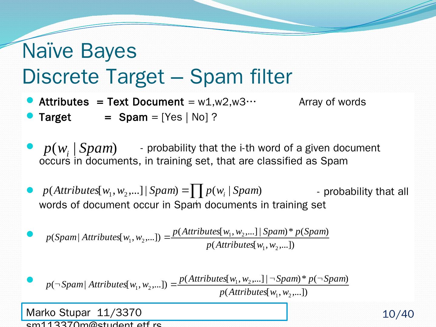 10 .Naïve Bayes Discrete Target – Spam filter Attributes = Text Document = w1,w2,w3… Array of words Target = Spam = [Yes | No] ? - probability that the i-th word of a given document occurs in documents, in training set, that are classified as Spam - probability that all words of document occur in Spam documents in training set Marko Stupar 11/3370 sm113370m@student.etf.rs 10 /40