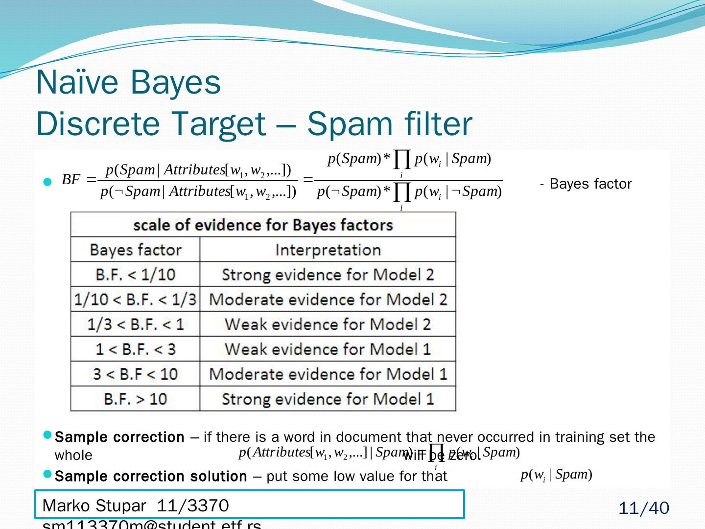 11 .Naïve Bayes Discrete Target – Spam filter - Bayes factor Sample correction – if there is a word in document that never occurred in training set the whole will be zero. Sample correction solution – put some low value for that Marko Stupar 11/3370 sm113370m@student.etf.rs 11 /40