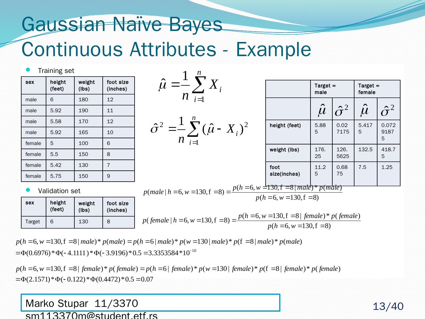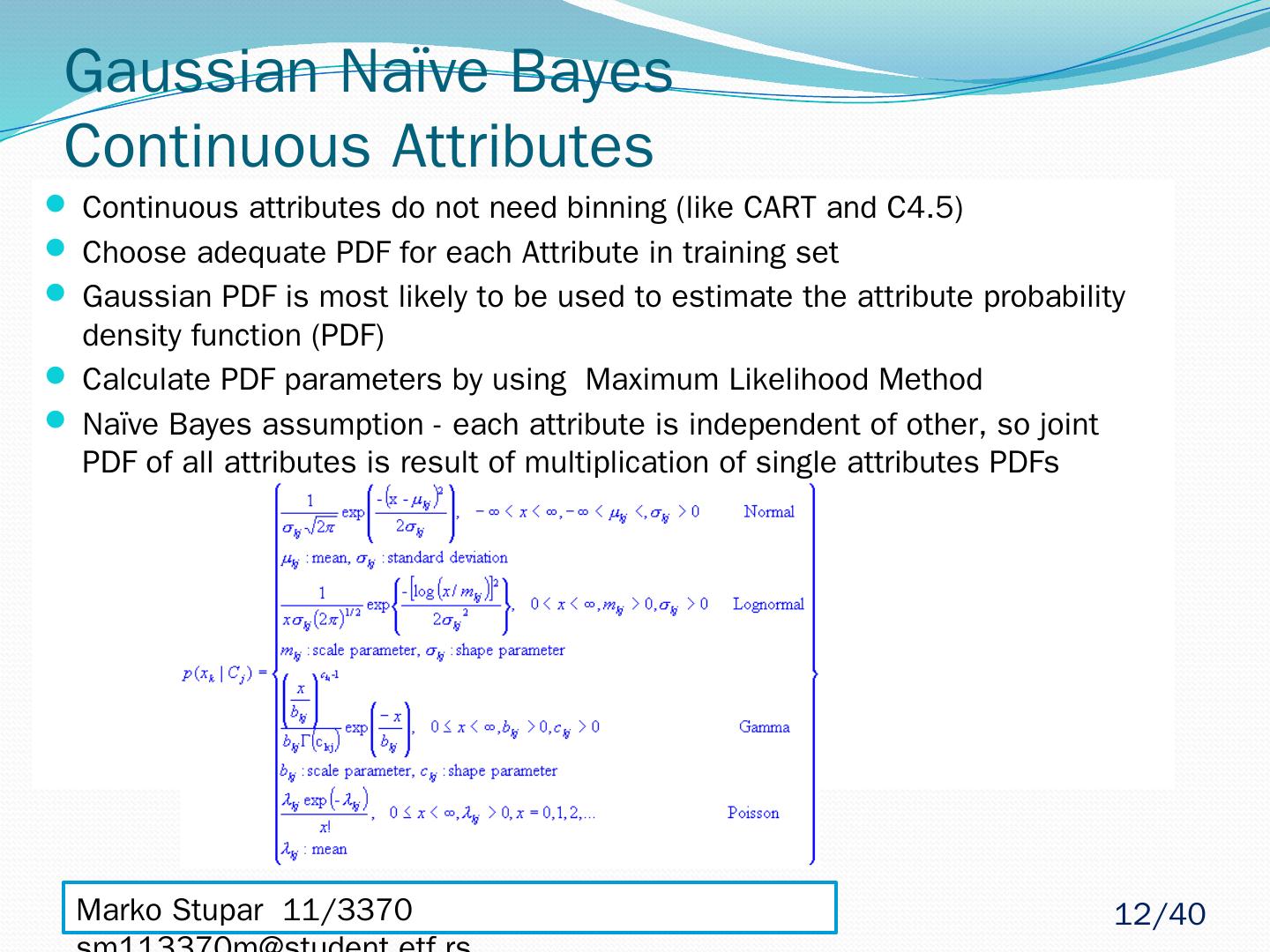 12 .Gaussian Naïve Bayes Continuous Attributes Continuous attributes do not need binning (like CART and C4.5) Choose adequate PDF for each Attribute in training set Gaussian PDF is most likely to be used to estimate the attribute probability density function (PDF) Calculate PDF parameters by using Maximum Likelihood Method Naïve Bayes assumption - each attribute is independent of other, so joint PDF of all attributes is result of multiplication of single attributes PDFs Marko Stupar 11/3370 sm113370m@student.etf.rs 12 /40