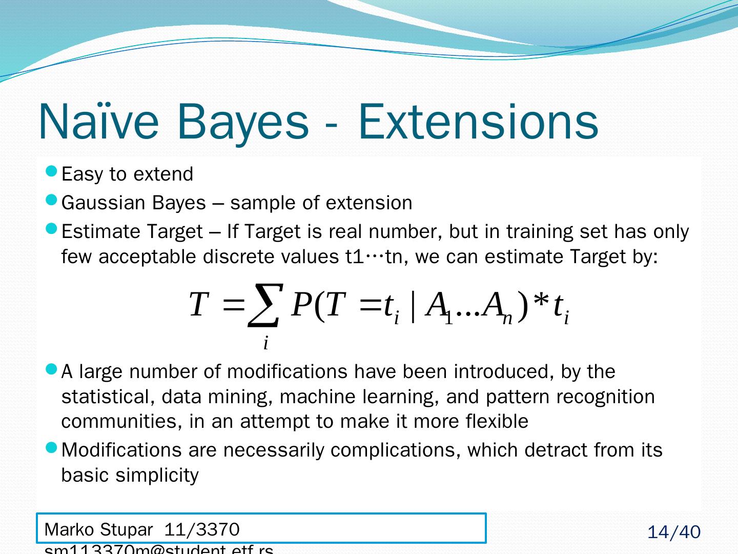 14 .Naïve Bayes - Extensions Easy to extend Gaussian Bayes – sample of extension Estimate Target – If Target is real number, but in training set has only few acceptable discrete values t1… tn , we can estimate Target by: A large number of modifications have been introduced, by the statistical, data mining, machine learning, and pattern recognition communities, in an attempt to make it more flexible Modifications are necessarily complications, which detract from its basic simplicity Marko Stupar 11/3370 sm113370m@student.etf.rs 14 /40