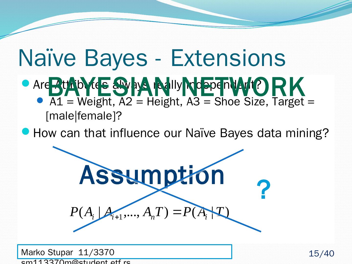 15 .Naïve Bayes - Extensions Are Attributes always really independent? A1 = Weight, A2 = Height, A3 = Shoe Size, Target = [ male|female ]? How can that influence our Naïve Bayes data mining? Assumption ? Bayesian network Marko Stupar 11/3370 sm113370m@student.etf.rs 15 /40