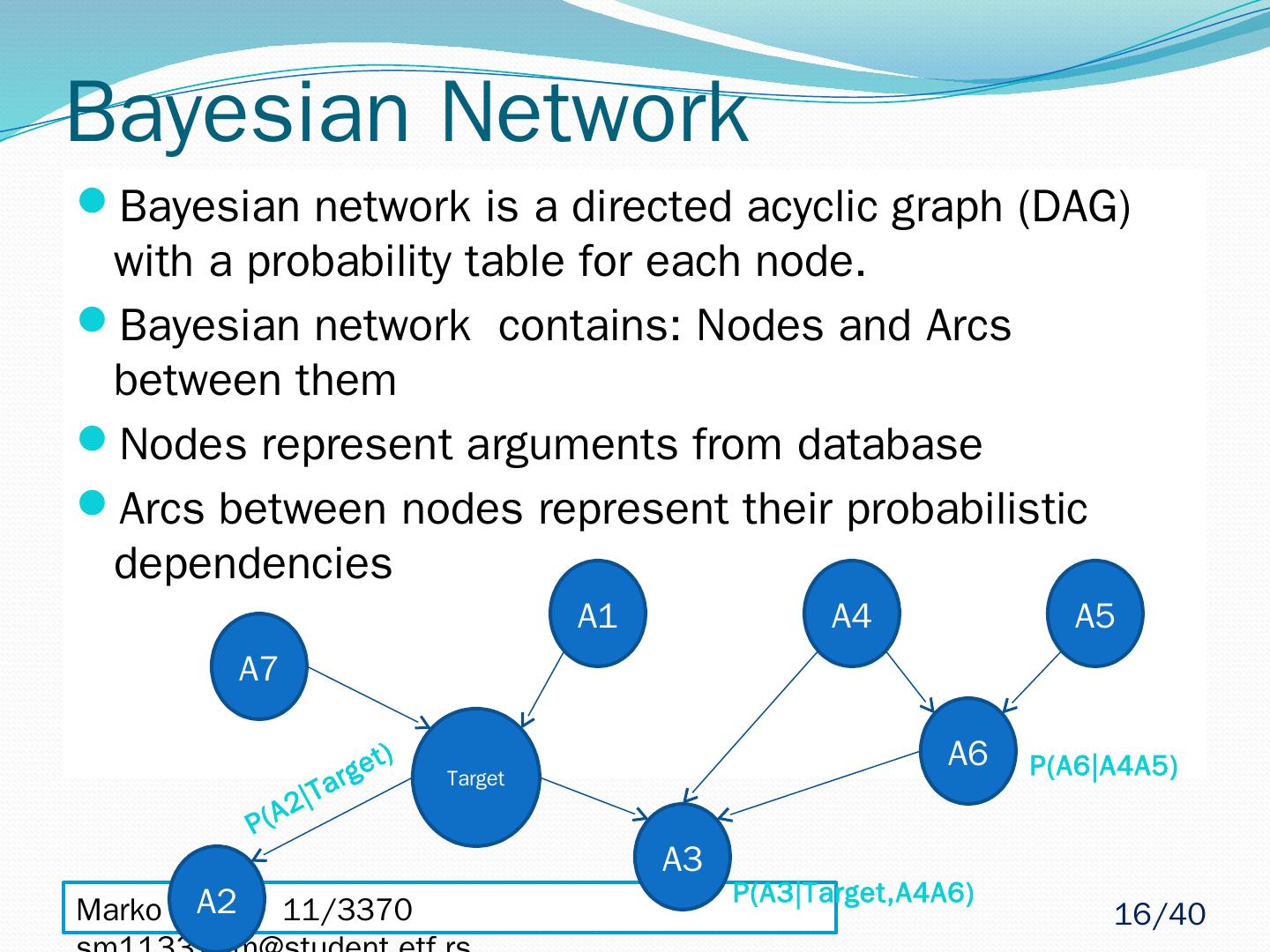 16 .Marko Stupar 11/3370 sm113370m@student.etf.rs Bayesian Network Bayesian network is a directed acyclic graph (DAG) with a probability table for each node. Bayesian network contains: Nodes and Arcs between them Nodes represent arguments from database Arcs between nodes represent their probabilistic dependencies Target A2 A1 A3 P(A2|Target) A6 A4 A5 P(A6|A4A5) A7 P(A3|Target,A4A6) 16 /40
