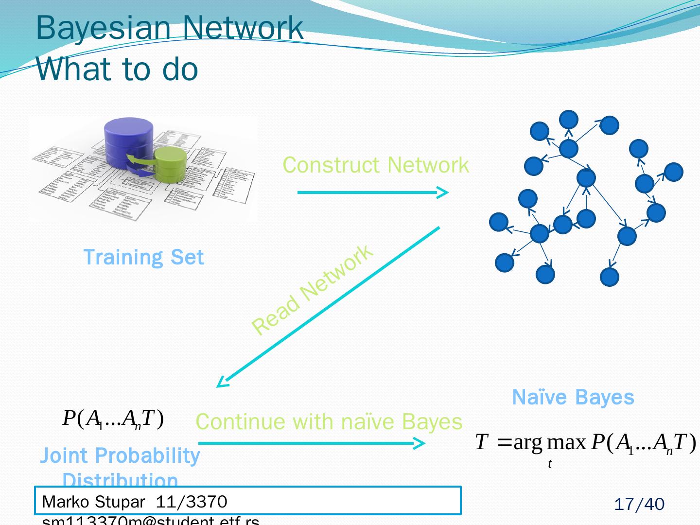 17 .Bayesian Network What to do Read Network Construct Network Training Set Continue with naïve Bayes Joint Probability Distribution Naïve Bayes Marko Stupar 11/3370 sm113370m@student.etf.rs 17 /40