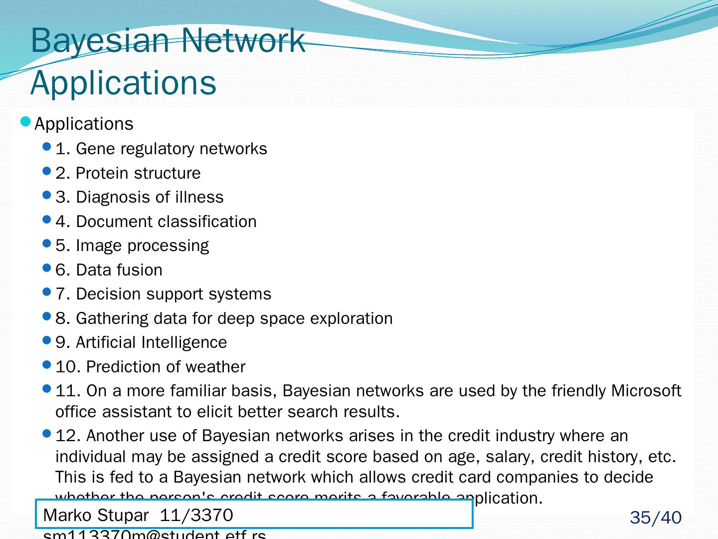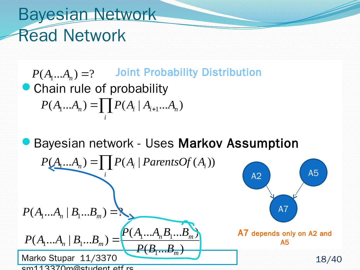 18 .Marko Stupar 11/3370 sm113370m@student.etf.rs Bayesian Network Read Network Chain rule of probability Bayesian network - Uses Markov Assumption A7 A2 A5 Joint Probability Distribution A7 depends only on A2 and A5 18 /40