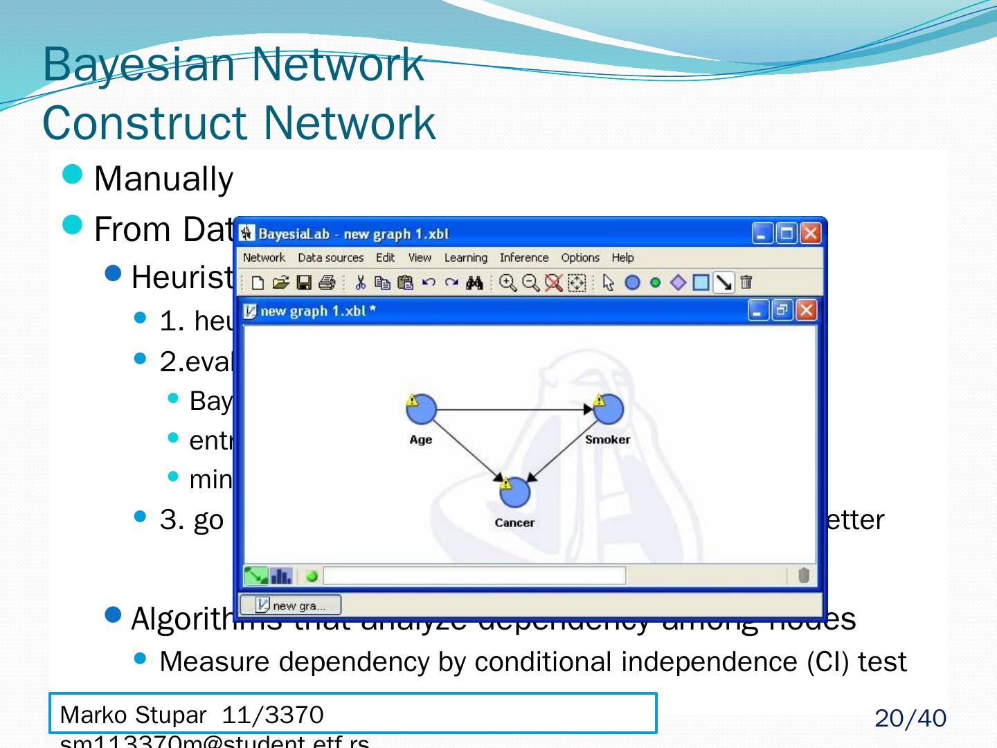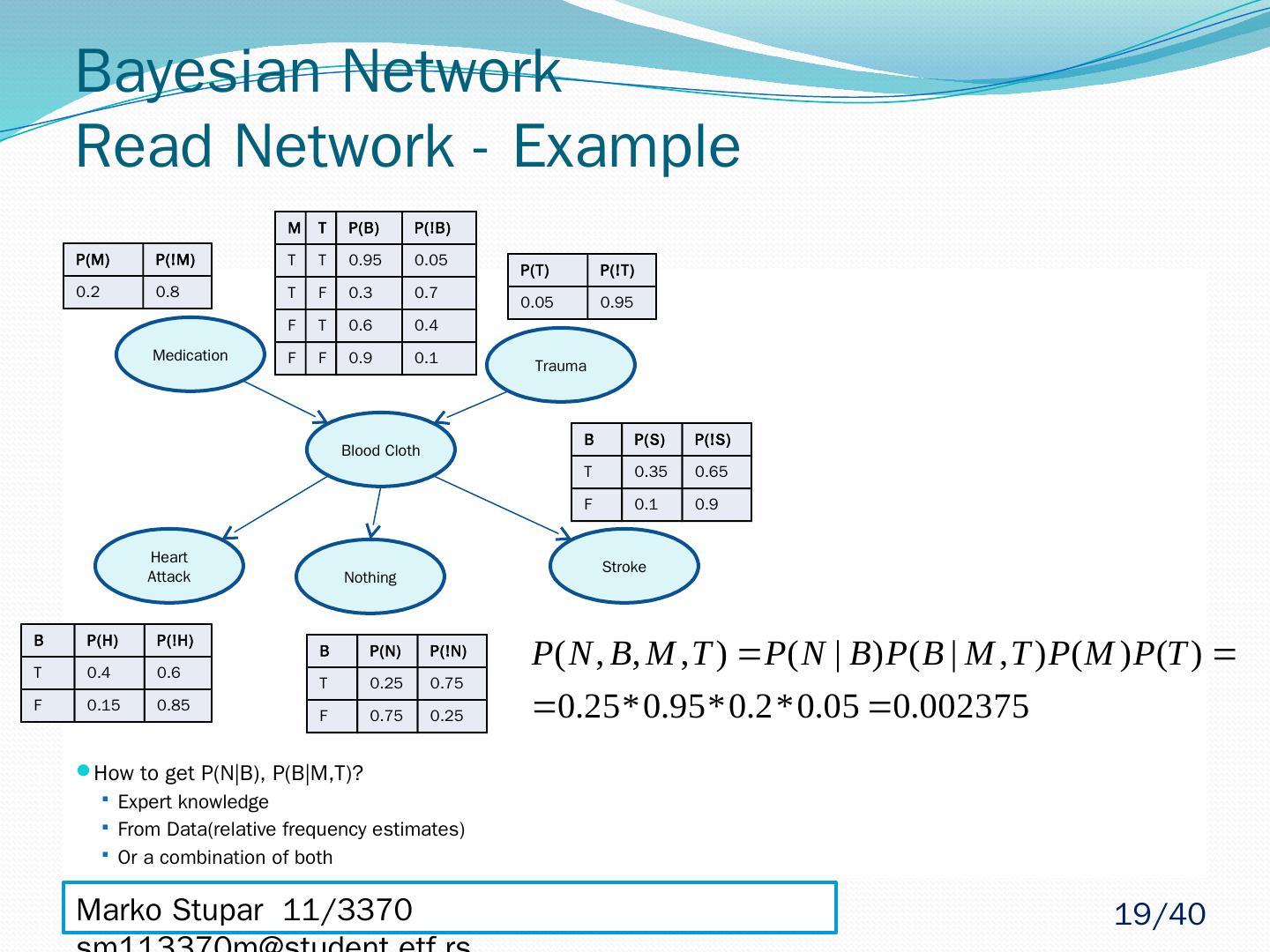 19 .Bayesian Network Read Network - Example How to get P(N|B), P(B|M,T)? Expert knowledge From Data(relative frequency estimates) Or a combination of both Medication Blood Cloth Trauma Heart Attack Nothing Stroke P(M) P(!M) 0.2 0.8 P(T) P(!T) 0.05 0.95 M T P(B) P(!B) T T 0.95 0.05 T F 0.3 0.7 F T 0.6 0.4 F F 0.9 0.1 B P(H) P(!H) T 0.4 0.6 F 0.15 0.85 B P(N) P(!N) T 0.25 0.75 F 0.75 0.25 B P(S) P(!S) T 0.35 0.65 F 0.1 0.9 Marko Stupar 11/3370 sm113370m@student.etf.rs 19 /40