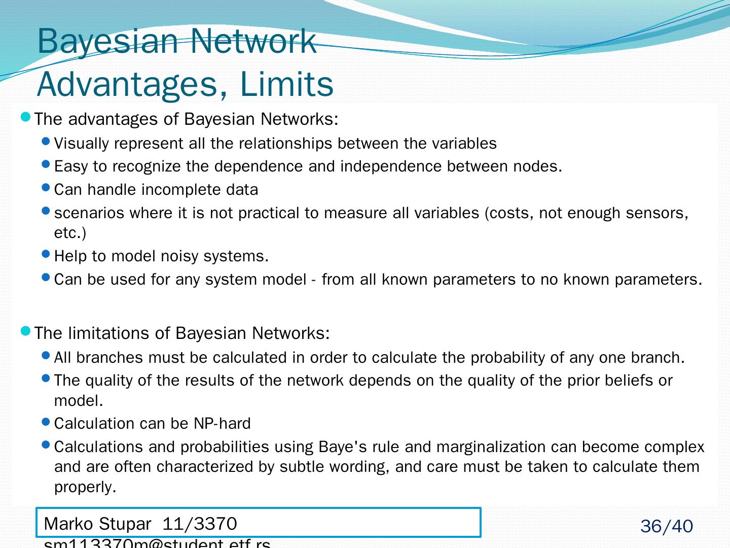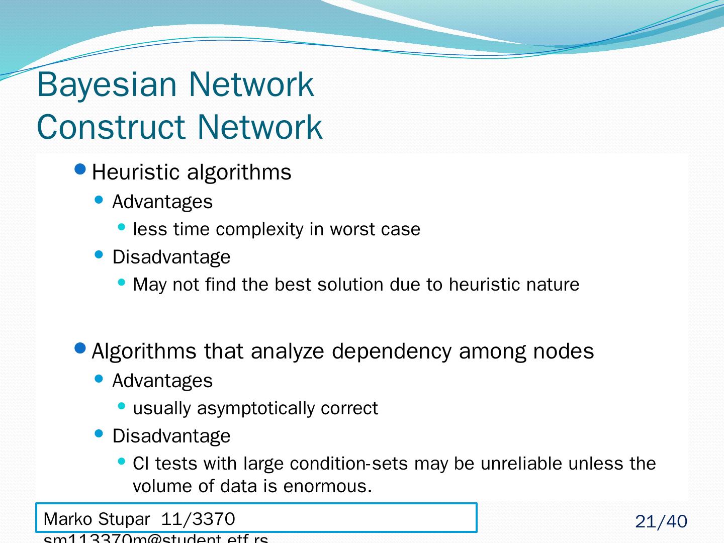 21 .Bayesian Network Construct Network Heuristic algorithms Advantages less time complexity in worst case Disadvantage May not find the best solution due to heuristic nature Algorithms that analyze dependency among nodes Advantages usually asymptotically correct Disadvantage CI tests with large condition-sets may be unreliable unless the volume of data is enormous. Marko Stupar 11/3370 sm113370m@student.etf.rs 21 /40