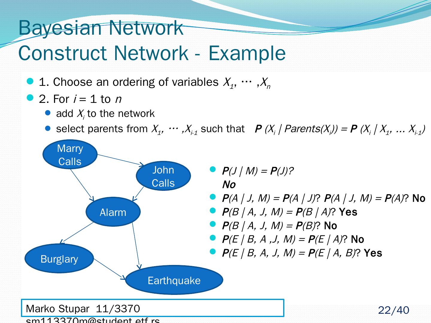 22 .Bayesian Network Construct Network - Example 1. Choose an ordering of variables X 1 , … , X n 2. For i = 1 to n add X i to the network select parents from X 1 , … ,X i-1 such that P (X i | Parents(X i )) = P (X i | X 1 , ... X i-1 ) Marko Stupar 11/3370 sm113370m@student.etf.rs Marry Calls John Calls Alarm Burglary Earthquake P (J | M) = P (J)? No P (A | J, M) = P (A | J) ? P (A | J, M) = P (A) ? No P (B | A, J, M) = P (B | A) ? Yes P (B | A, J, M) = P (B) ? No P (E | B, A ,J, M) = P (E | A) ? No P (E | B, A, J, M) = P (E | A, B) ? Yes 22 /40