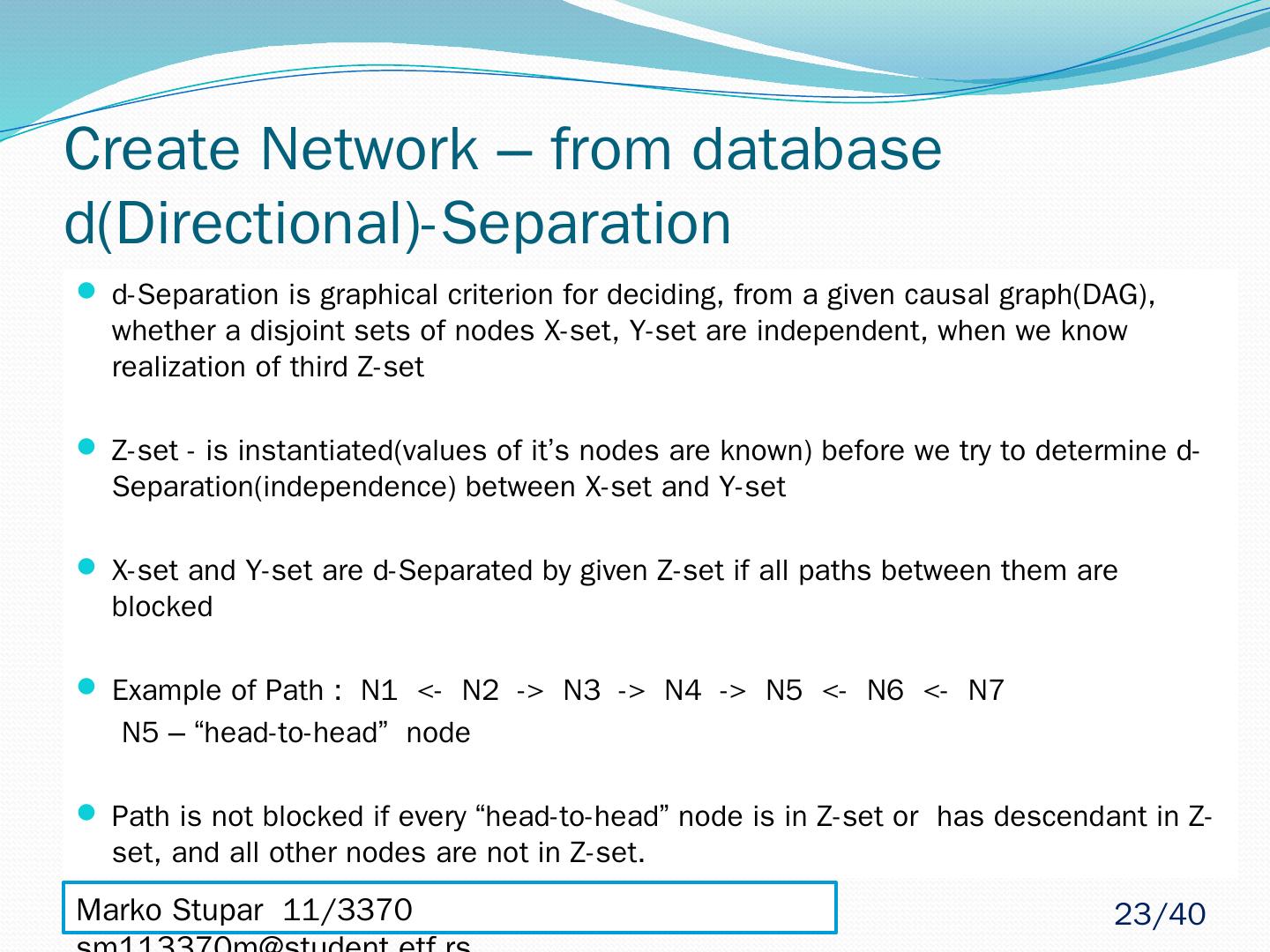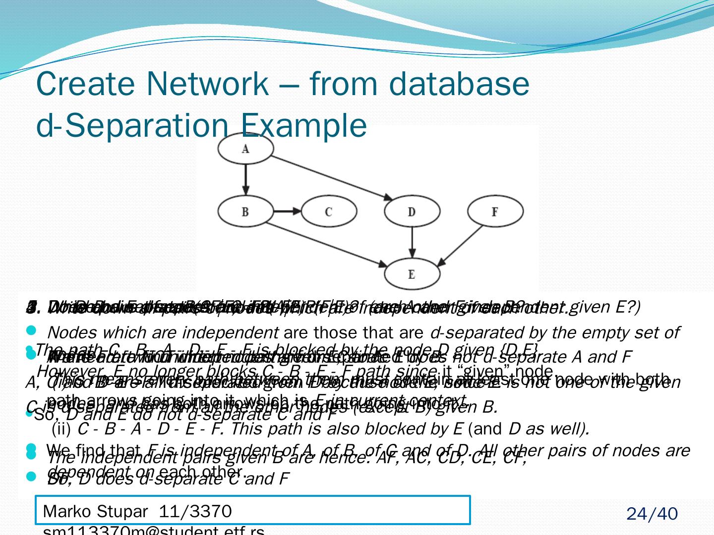 23 .Create Network – from database d(Directional)-Separation d-Separation is graphical criterion for deciding, from a given causal graph(DAG), whether a disjoint sets of nodes X-set, Y-set are independent, when we know realization of third Z-set Z-set - is instantiated(values of it’s nodes are known) before we try to determine d-Separation(independence) between X-set and Y-set X-set and Y-set are d-Separated by given Z-set if all paths between them are blocked Example of Path : N1 <- N2 -> N3 -> N4 -> N5 <- N6 <- N7 N5 – “head-to-head” node Path is not blocked if every “head-to-head” node is in Z-set or has descendant in Z-set, and all other nodes are not in Z-set. Marko Stupar 11/3370 sm113370m@student.etf.rs 23 /40