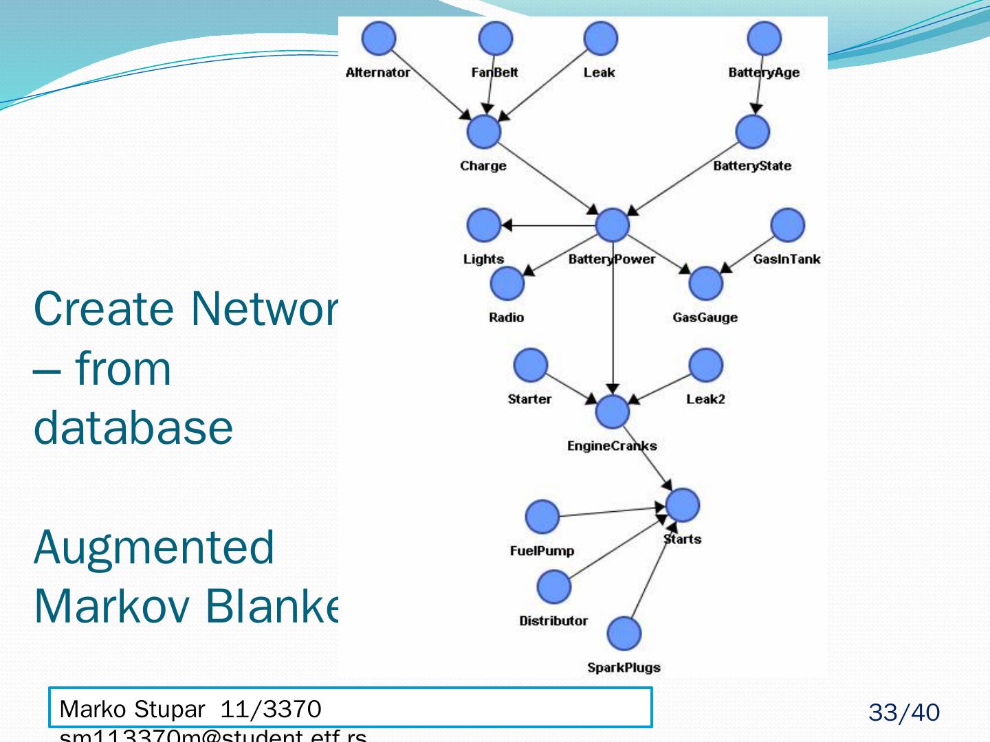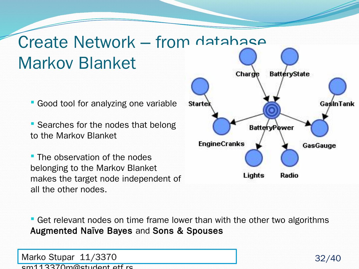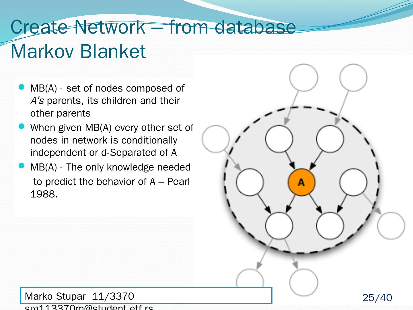 25 .Create Network – from database Markov Blanket MB(A) - set of nodes composed of A’s parents, its children and their other parents When given MB(A) every other set of nodes in network is conditionally independent or d-Separated of A MB(A) - The only knowledge needed to predict the behavior of A – Pearl 1988. Marko Stupar 11/3370 sm113370m@student.etf.rs 25 /40
