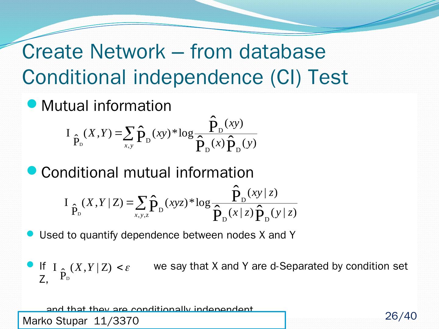 26 .Mutual information Conditional mutual information Used to quantify dependence between nodes X and Y If we say that X and Y are d-Separated by condition set Z, and that they are conditionally independent Marko Stupar 11/3370 sm113370m@student.etf.rs Create Network – from database Conditional independence (CI) Test 26 /40