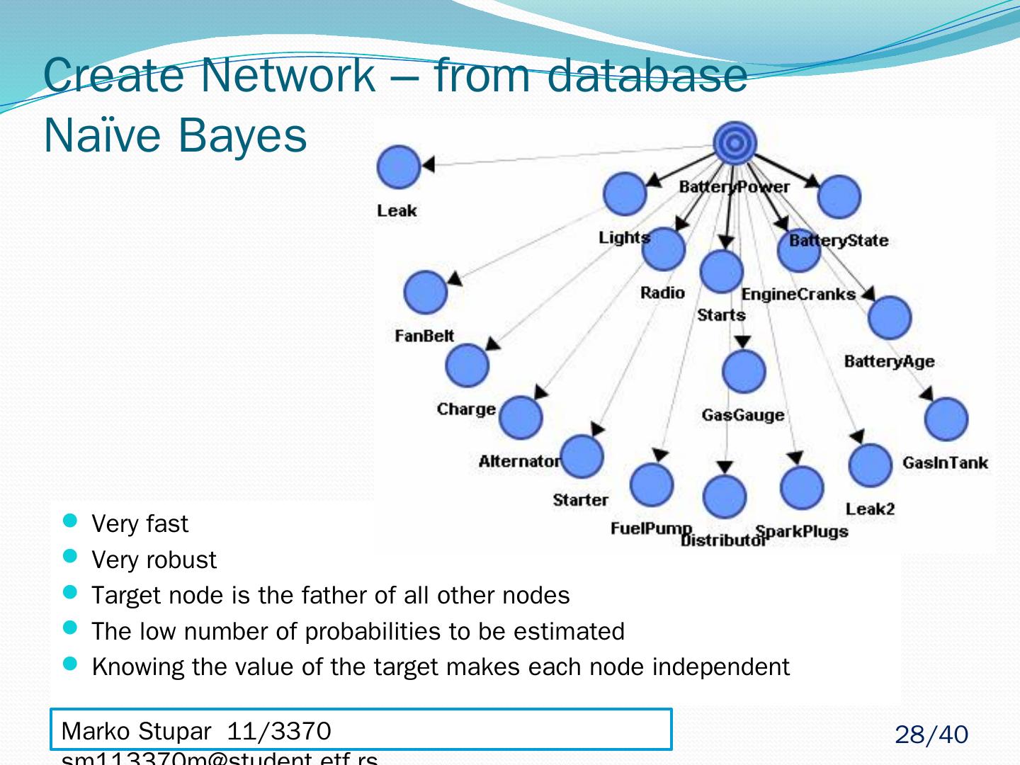 28 .Create Network – from database Naïve Bayes Very fast Very robust Target node is the father of all other nodes The low number of probabilities to be estimated Knowing the value of the target makes each node independent Marko Stupar 11/3370 sm113370m@student.etf.rs 28 /40