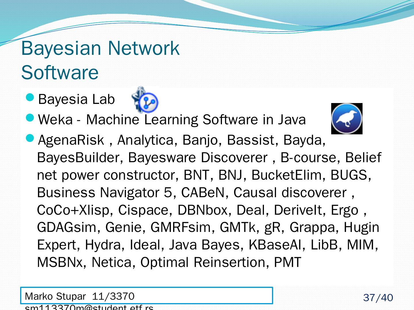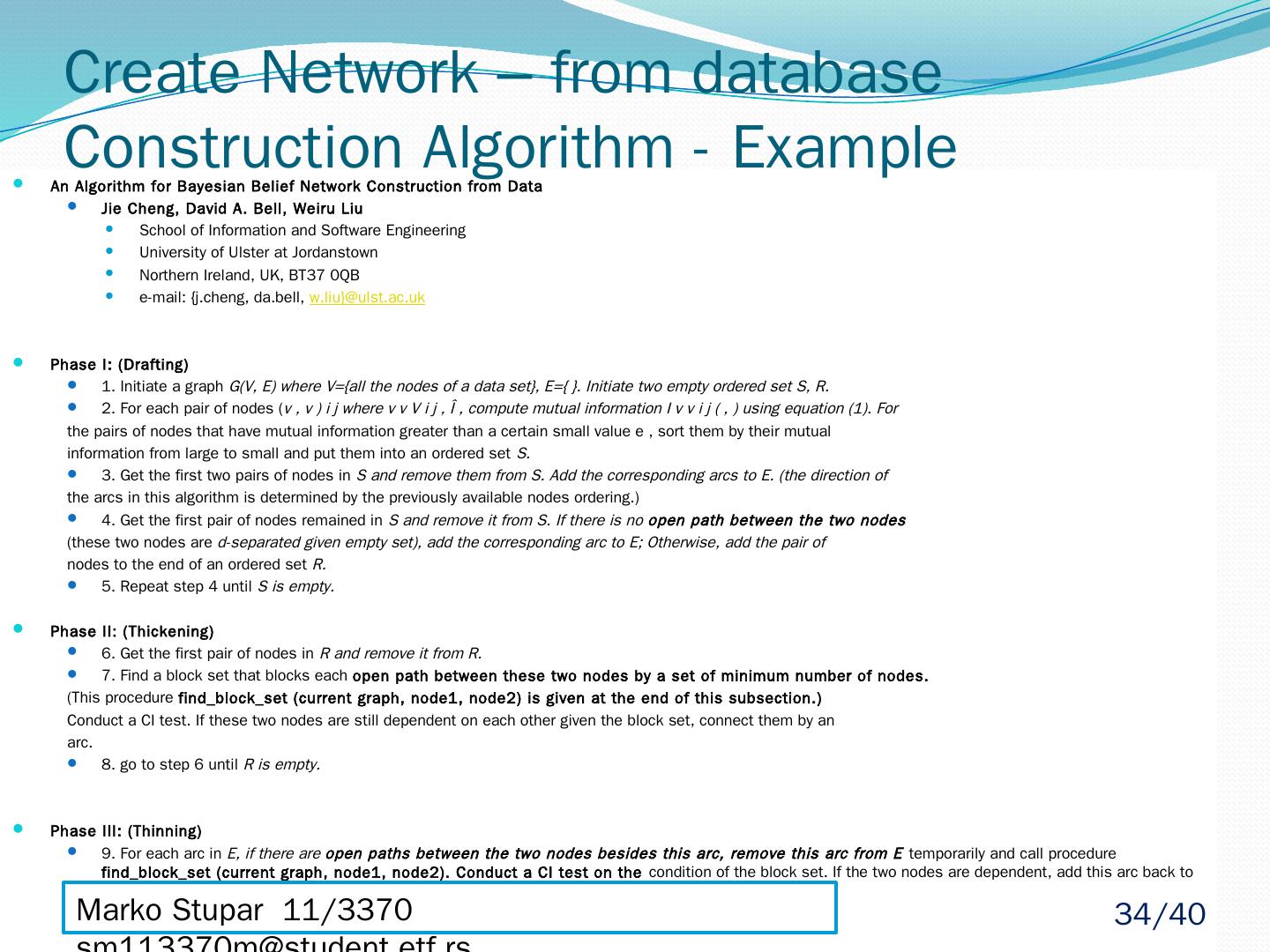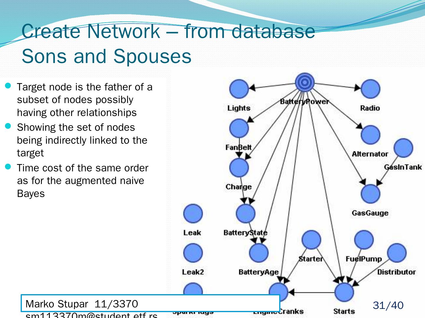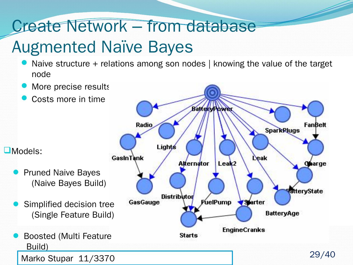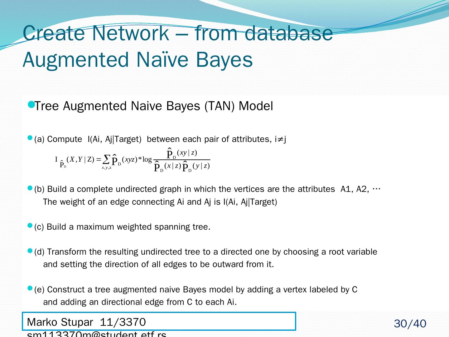 29 .Create Network – from database Augmented Naïve Bayes Naive structure + relations among son nodes | knowing the value of the target node More precise results than with the naive architecture Costs more in time Models: Pruned Naive Bayes (Naive Bayes Build) Simplified decision tree (Single Feature Build) Boosted (Multi Feature Build) Marko Stupar 11/3370 sm113370m@student.etf.rs 29 /40