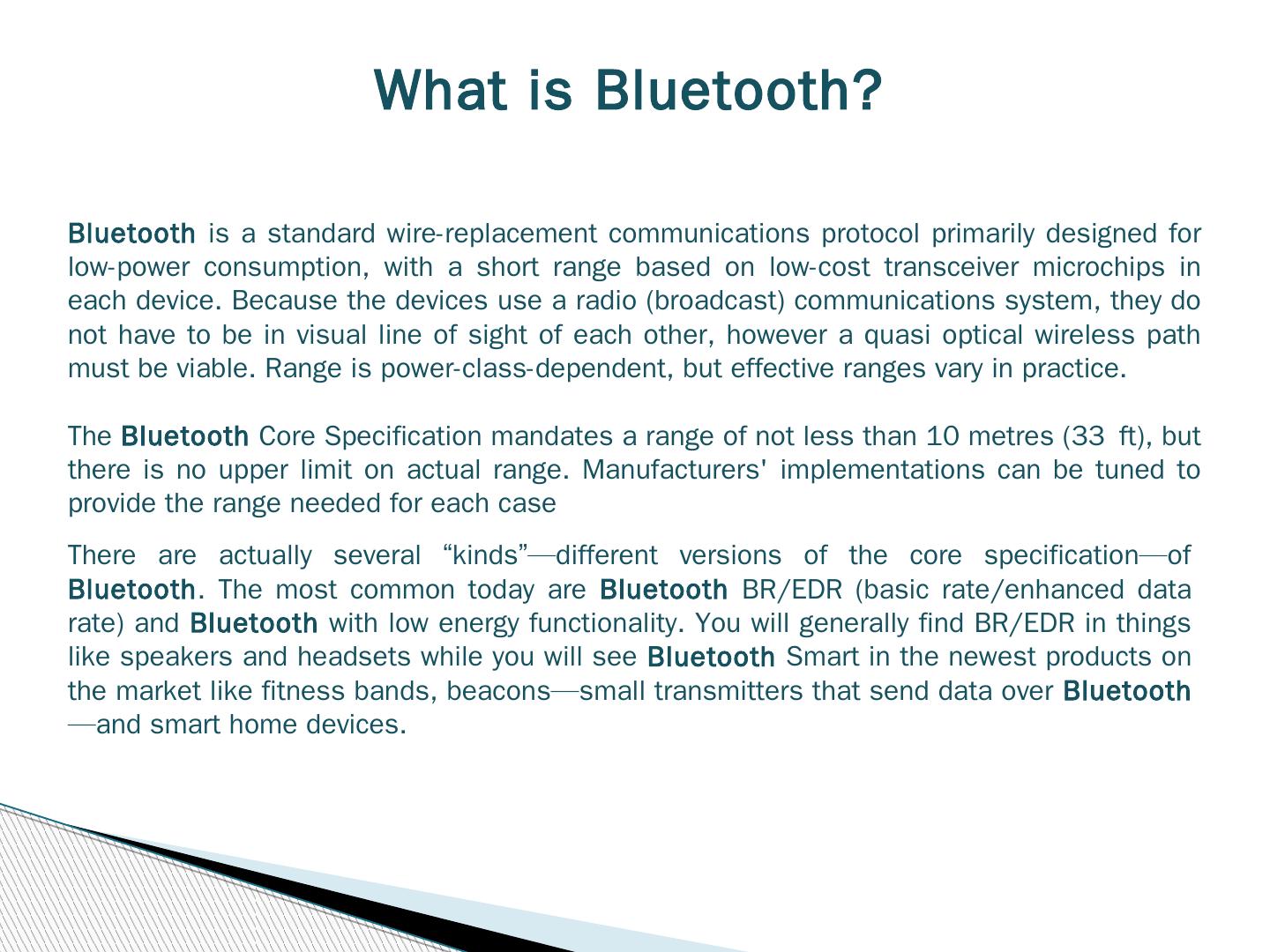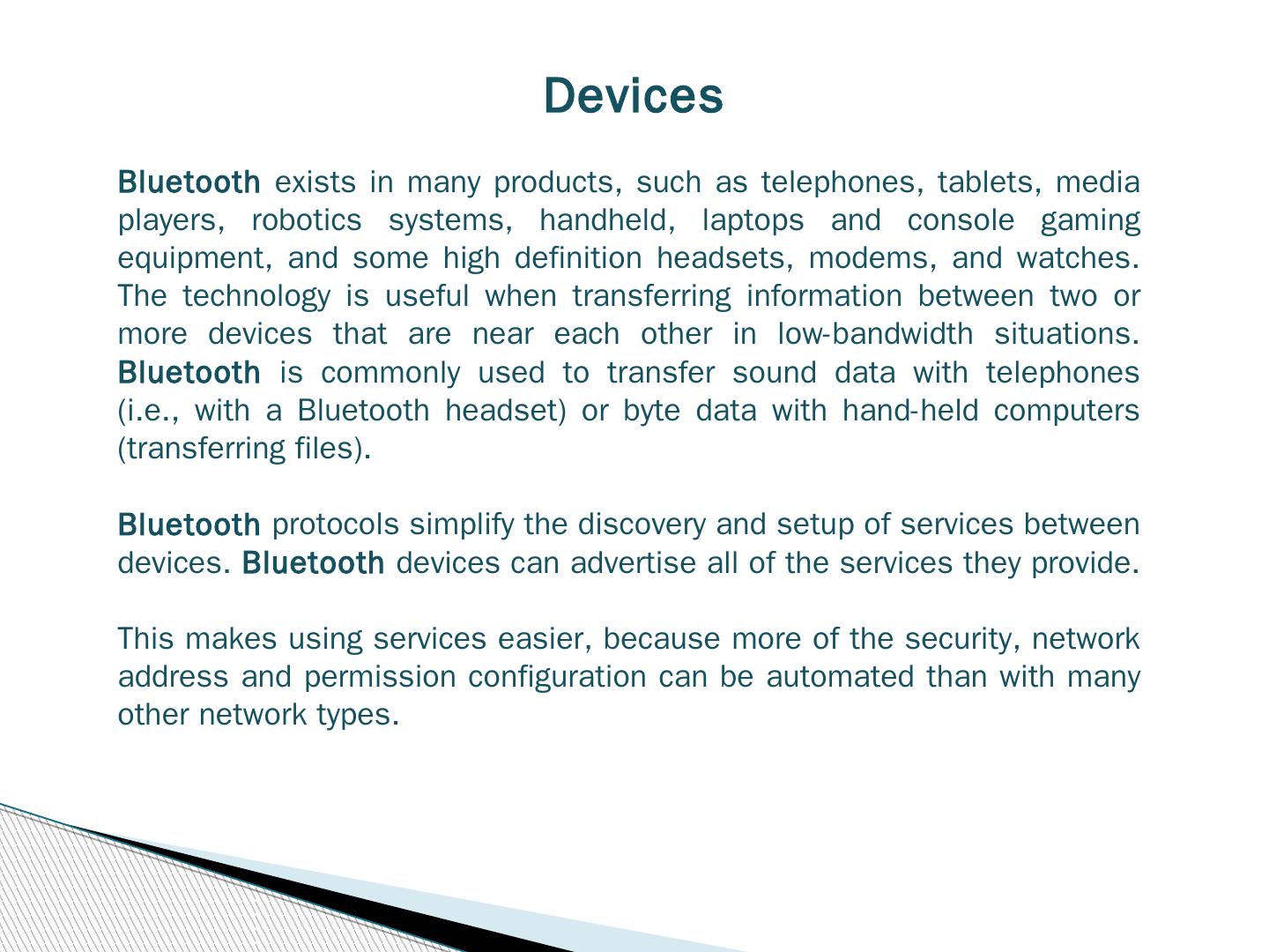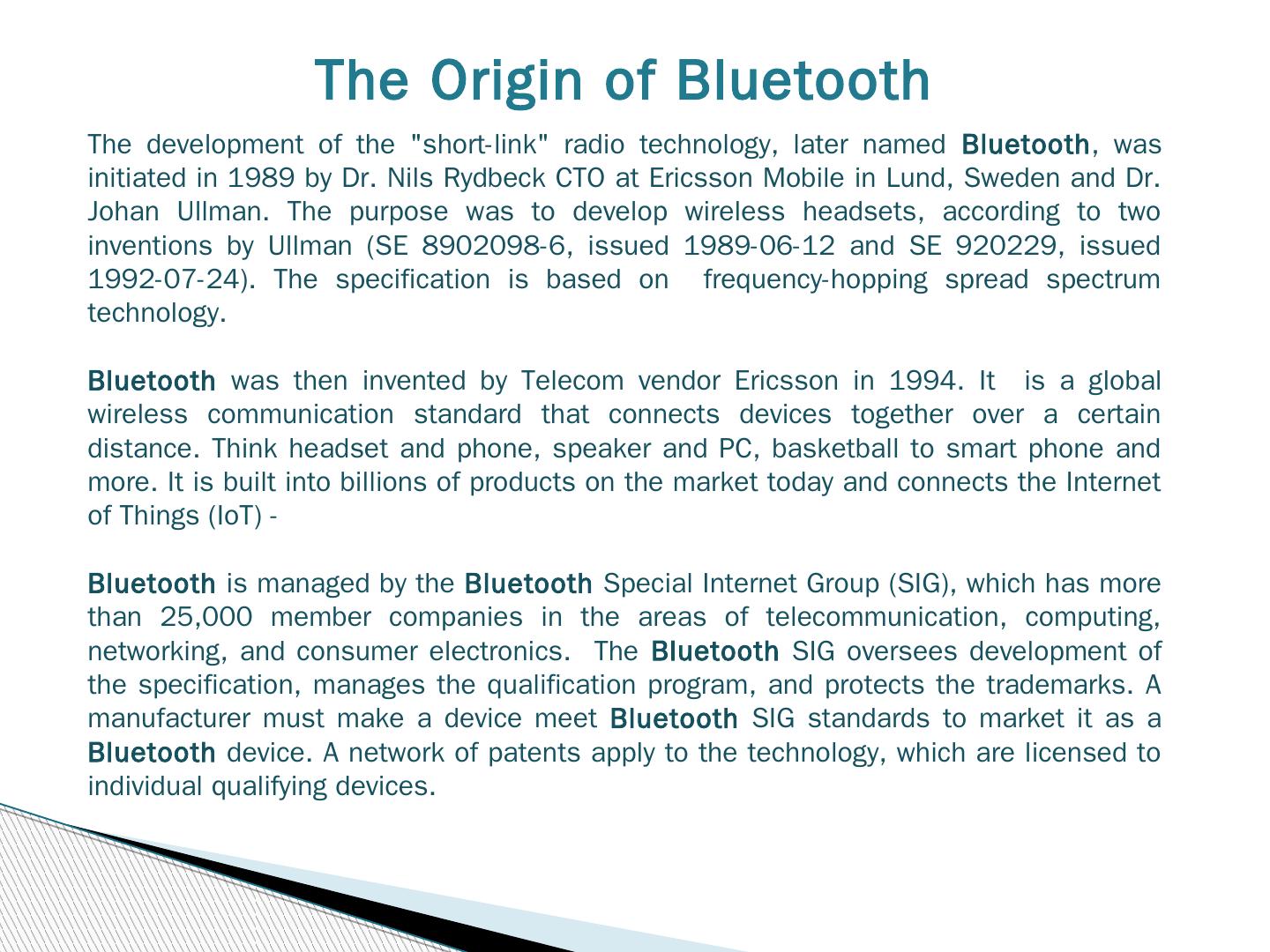 The development of the "short-link" radio technology, later named Bluetooth, ... Bluetooth protocols simplify the discovery and setup of services between devices.